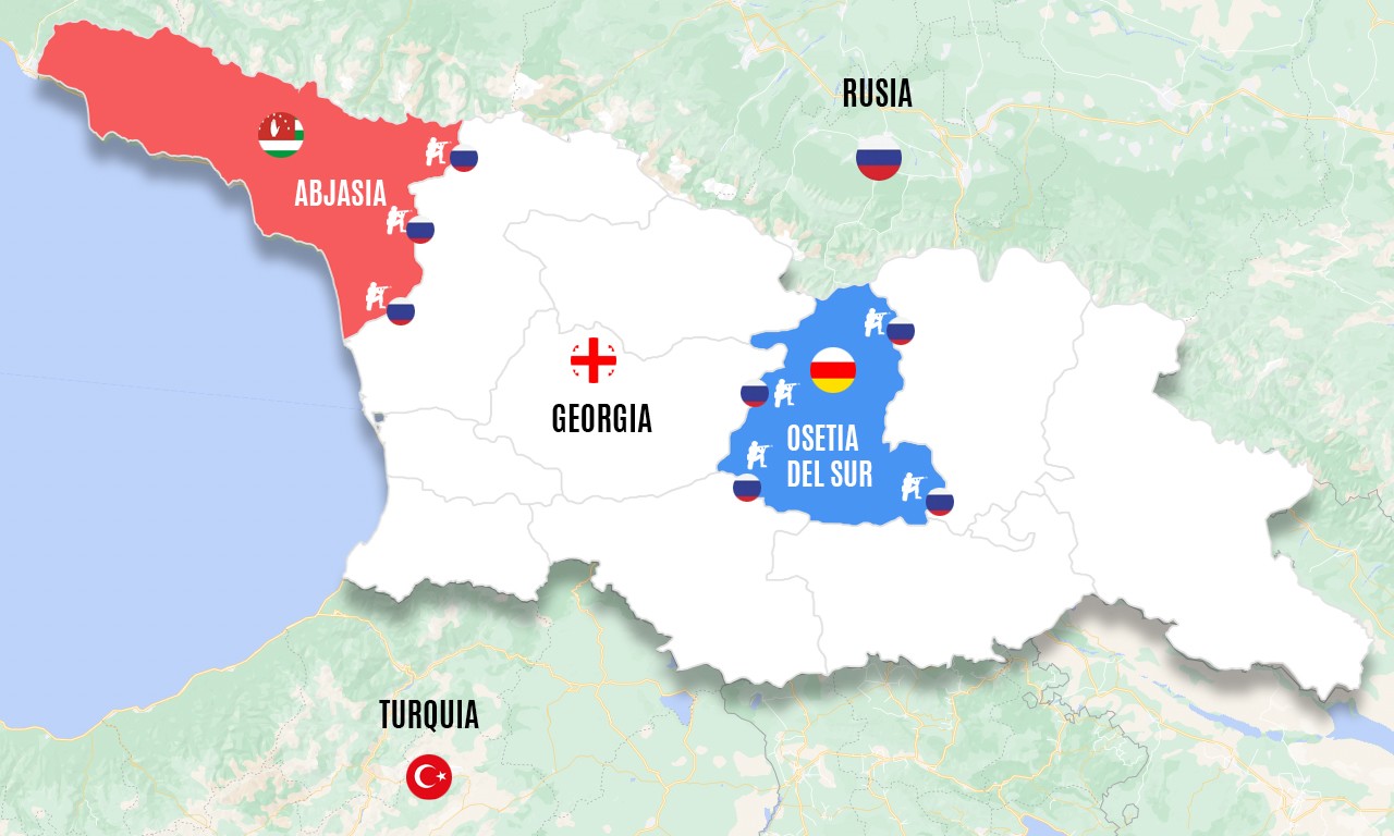 Abjasia y Osetia del Sur son dos repúblicas independientes de facto cuya independencia de Georgia solo está reconocida por Rusia, Venezuela, Nicaragua, Siria y Nauru, además de la república fantasma de Transnistria. También se reconocen entre ellas mismas. Las tensiones comenzaron en los ochenta, antes de la disolución de la URSS, con las aspiraciones de las élites georgianas de independizarse de Moscú y decidir por libre su propio futuro.