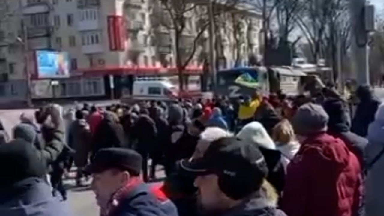 A pesar de que Jersón es una ciudad ocupada, sus ciudadanos han desafiado el control de Putin y se han lanzado a las calles para mostrar su rechazo al ejército invasor ruso. Según se ve en las imágenes, una multitud se manifiesta con banderas ucranianas en la avenida Ushakova, cuando se topan al menos tres vehículos rusos marcados con la letra Z.