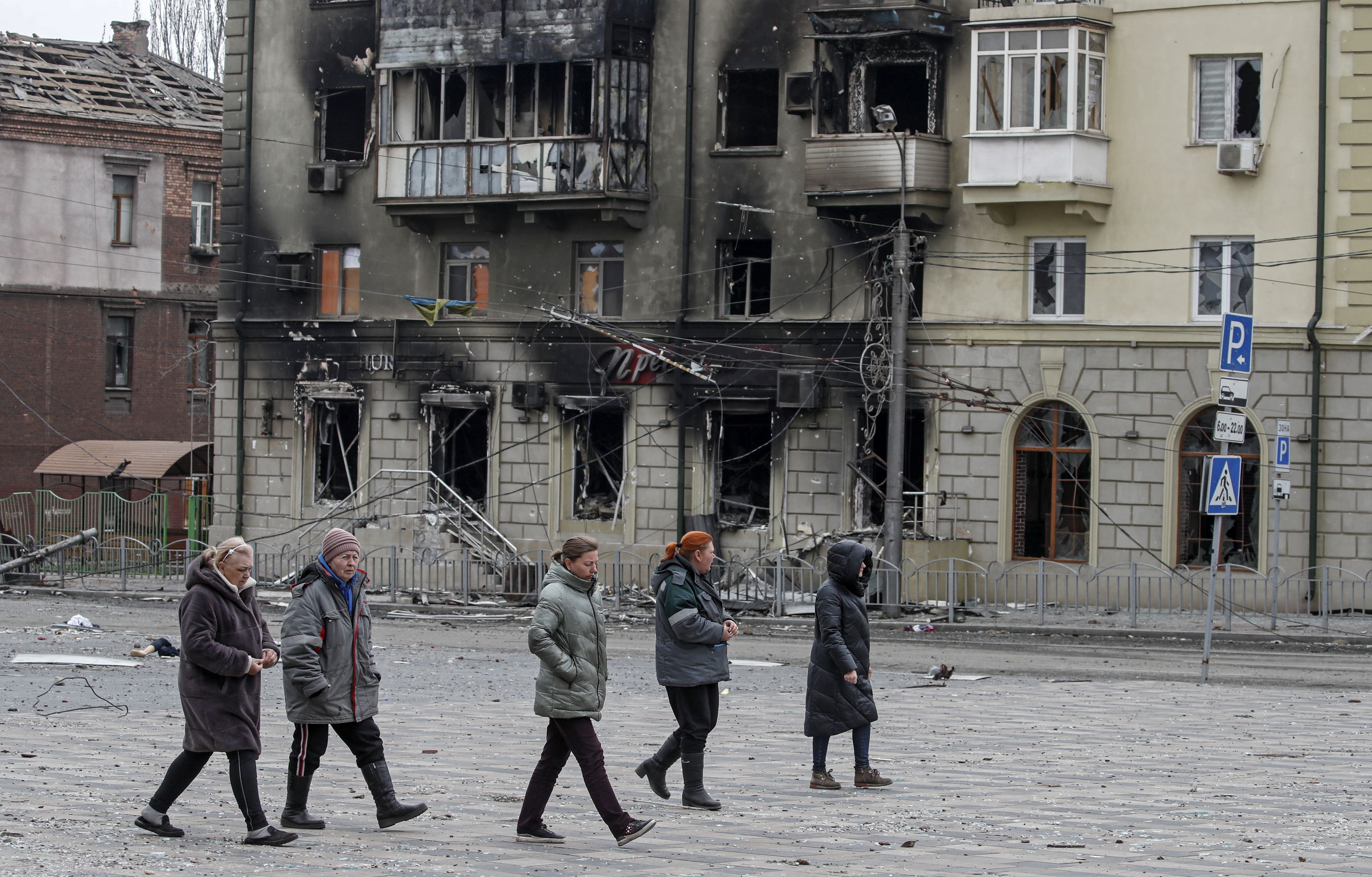 Kuleba afirma que Mariúpol "ya no existe" y recalca que la situación en la ciudad es "descorazonadora". Varias personas caminan por la ciudad de Mariúpol frente a uno edificio quemado.
