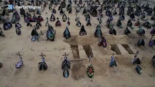 Es el inmenso cementerio de Irpin en el que siguen abriendo fosas para enterrar a los muertos desde que empezó la invasión rusa el 24 de febrero. Un dron nos ofrece la imagen de esta gigantesca explanada de tierra llena de sencillas cruces con una foto del muerto.