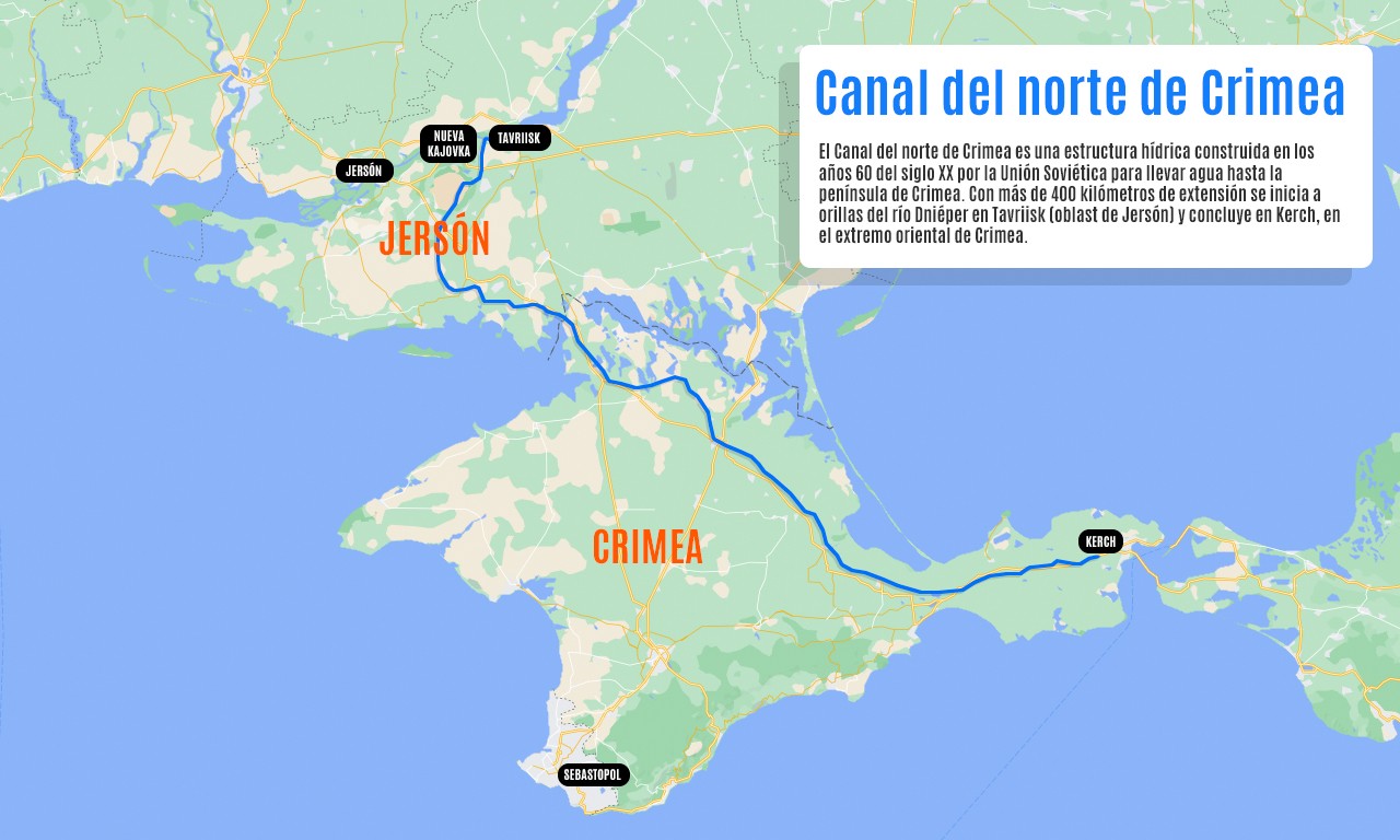 Se trata del conocido como Canal del norte de Crimea, una infraestructura hídrica que el régimen soviético de Leonid Brézhnev construyó en la década de los sesenta del siglo pasado con el objetivo de llevar agua hasta la península de Crimea, tanto para uso de la población como para uso agrícola e industrial. Un proyecto de más de 400 kilómetros de longitud que se inicia a orillas del río Dniéper en Tavriisk, junto a nueva Nueva Kajovka, y concluye en Kerch, en el extremo oriental de Crimea.