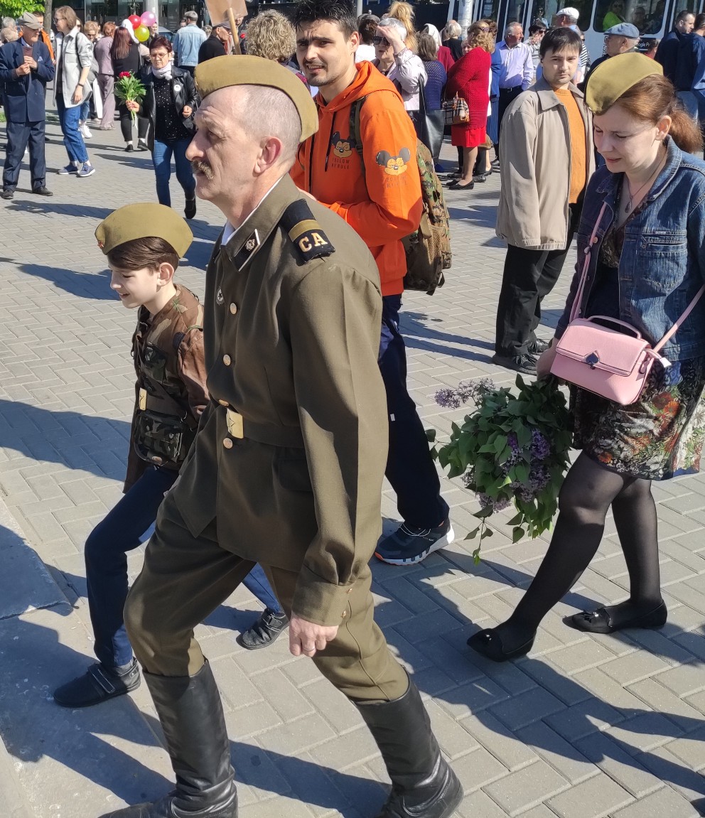 Un veterano del Ejército Rojo, con unos claveles rojos en la mano.