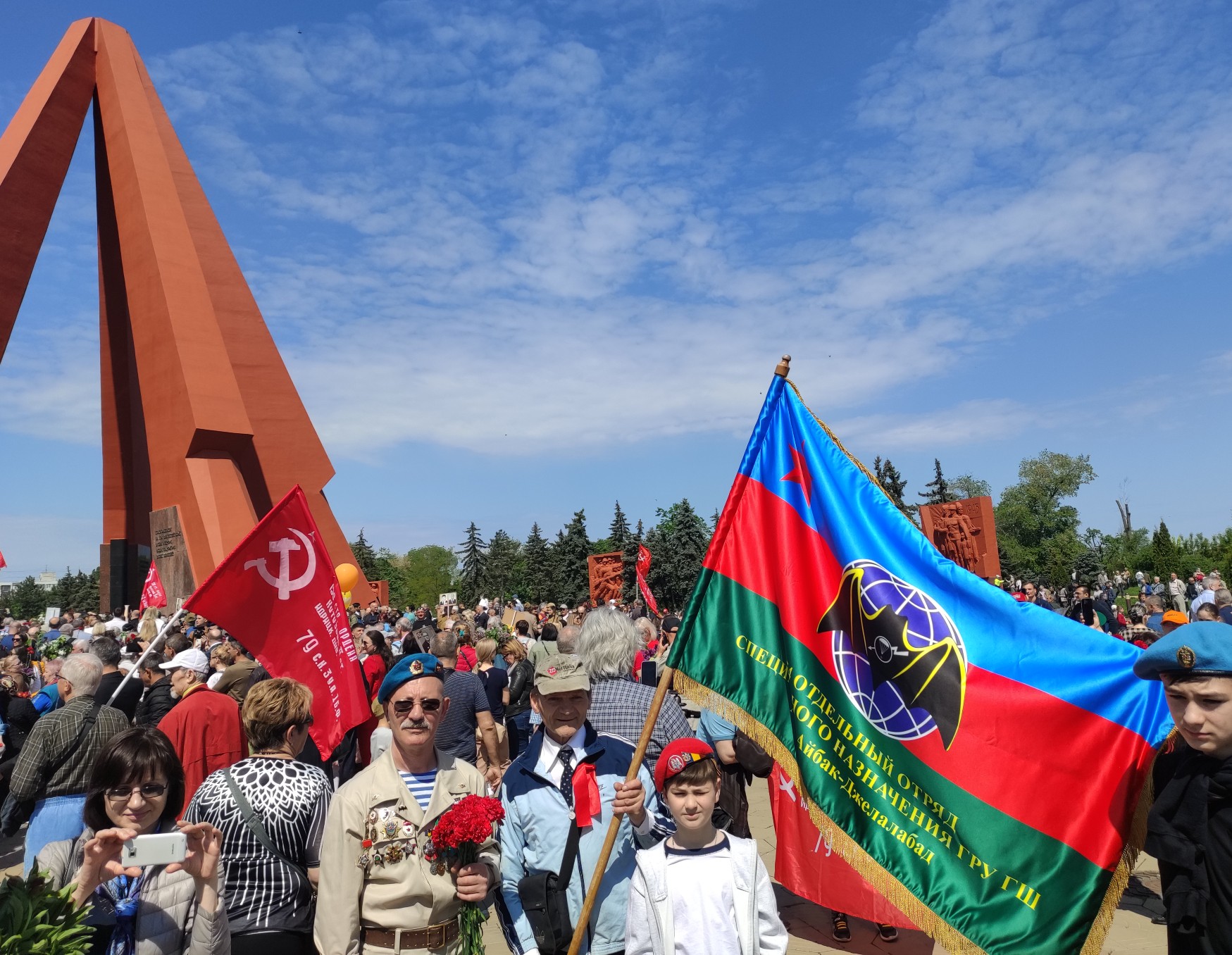 Participantes en los actos conmemorativos, a los pies del monumento a los caídos soviéticos en la II Guerra Mundial.