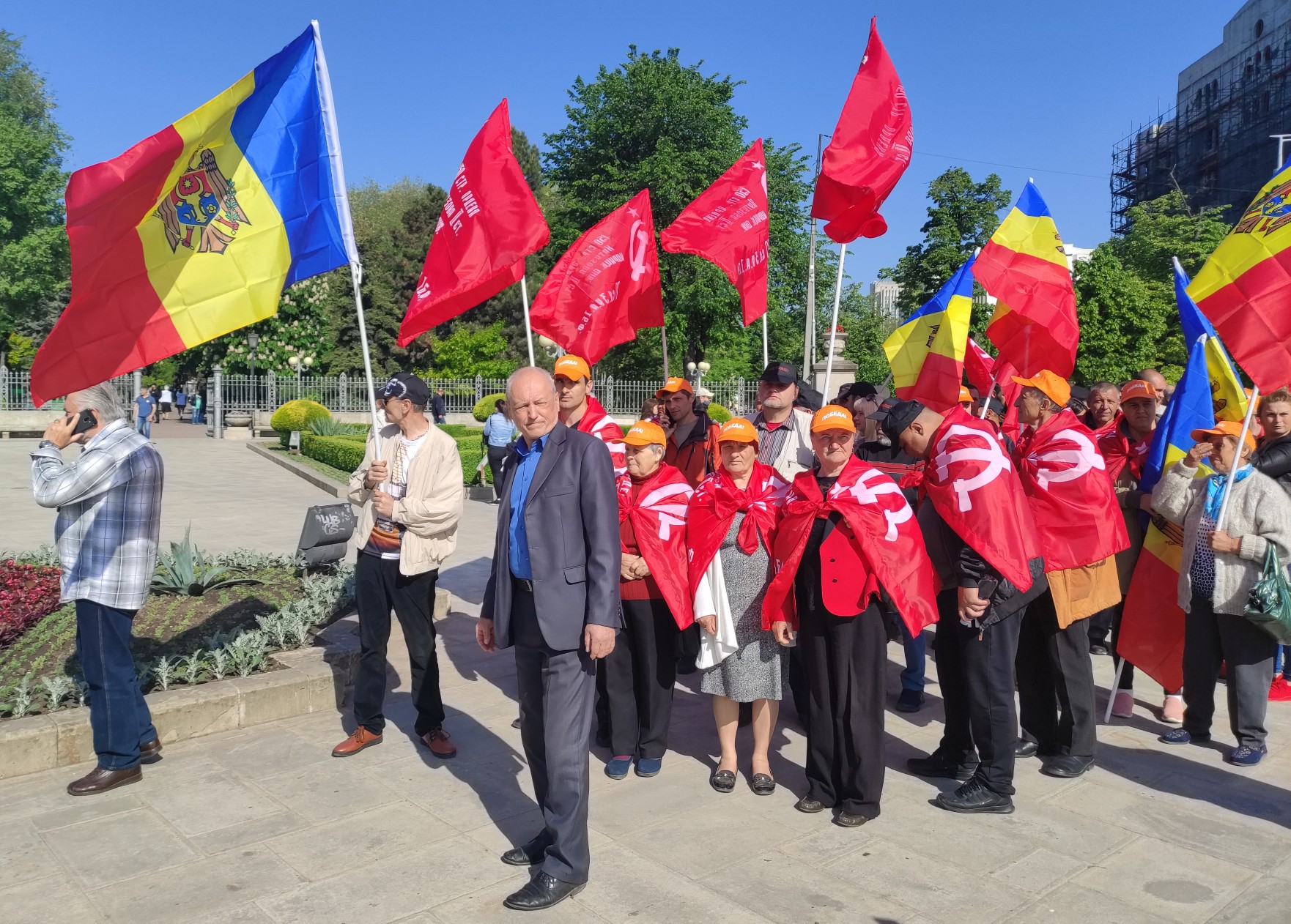 Un grupo de moldavos se dispone a participar en los actos conmemorativos con profusión de banderas rojas.