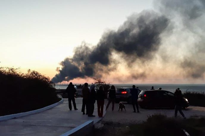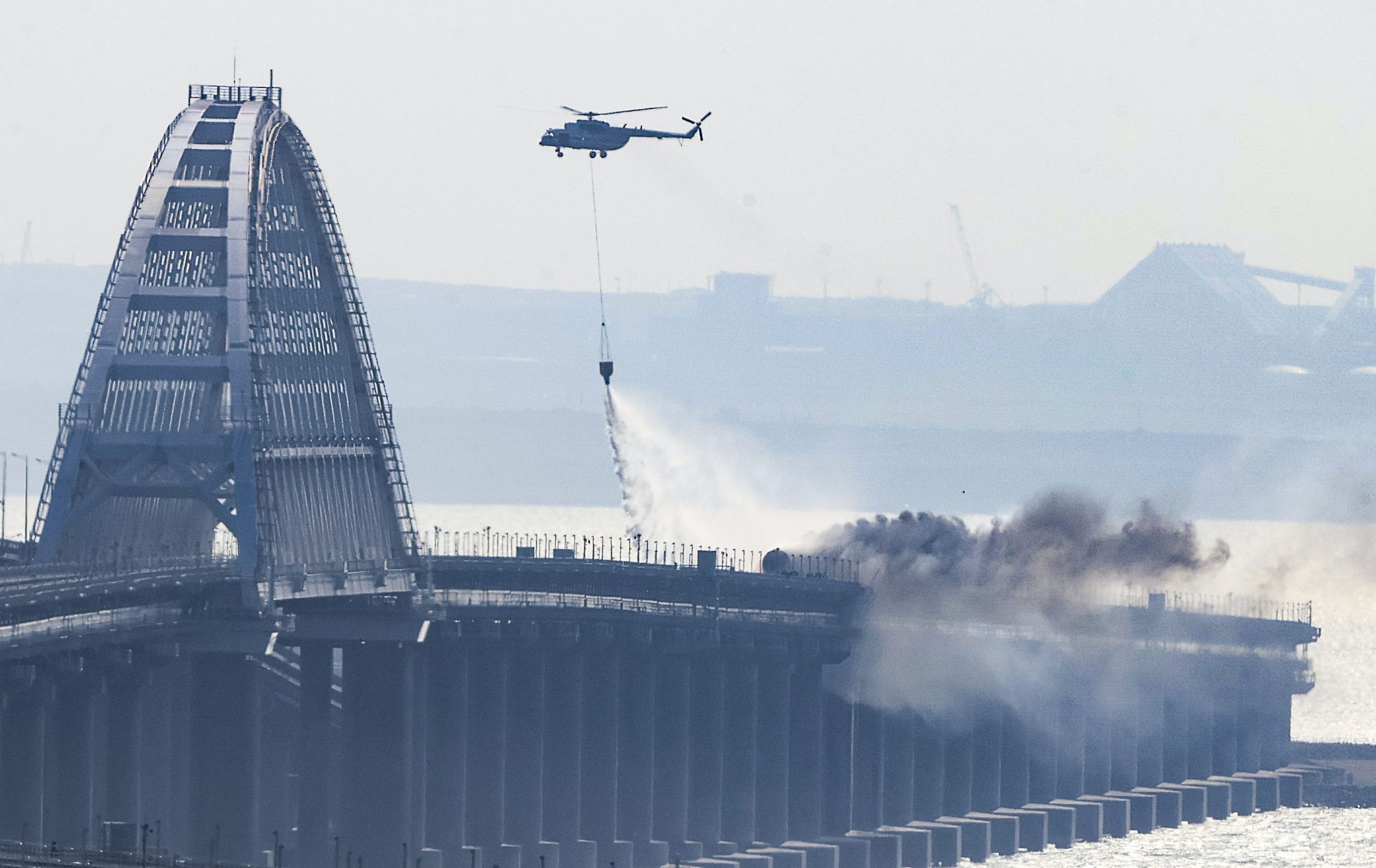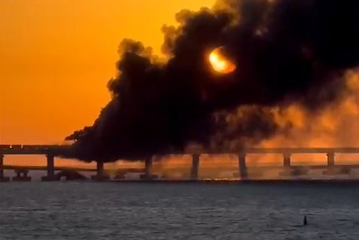 El sol se intuye entre el humo provocado por la explosión el puente de Crimea. Rusia estima que los daños pueden superar los ocho millones de euros.