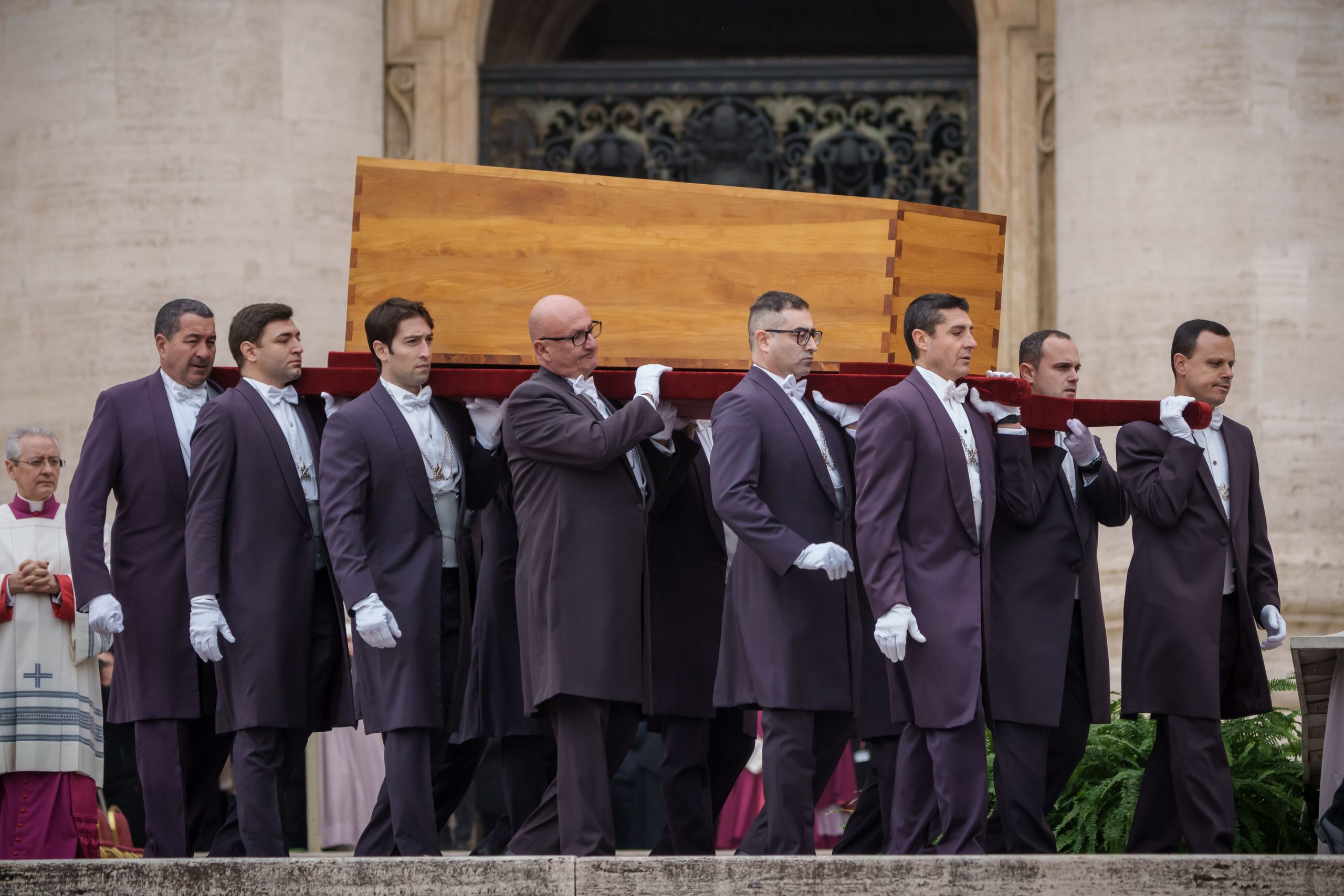 Sus restos han sido colocados en un ataúd de ciprés. Ese es el que está en la plaza de San Pedro para el funeral. Al acabar la ceremonia, este ataúd será trasladado de nuevo a la basílica de San Pedro y se introducirá en otros dos féretros, que se contienen el uno a otro. De esta manera, la primera capa del triple ataúd está elaborada en ciprés, mientras que la capa del medio será de zinc y la tercera estará tallada en roble. Tanto la preparación del cuerpo para el sepelio, previo al funeral como el último pasaje serán privados, y, por tanto, no está previsto que haya ni cámaras ni periodistas.