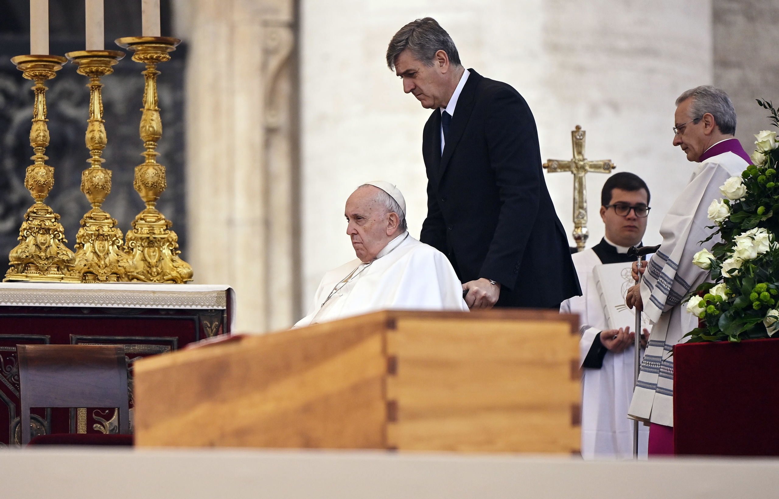 El Papa Francisco junto al ataúd durante el funeral del Papa Emérito Benedicto XVI en la Plaza de San Pedro, Ciudad del Vaticano, el 5 de enero de 2023. El ex Papa Benedicto XVI murió el 31 de diciembre de 2022 en su residencia del Vaticano, a la edad de 95 años.