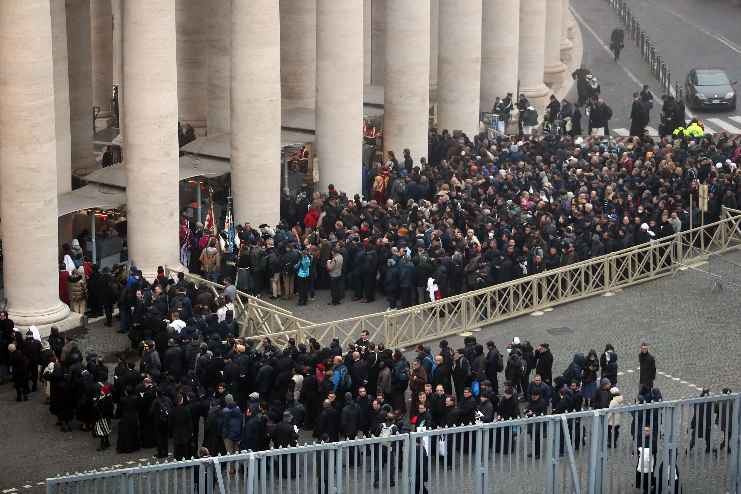 Varios clérigos antes de la ceremonia fúnebre por el Papa emérito Benedicto XVI (Joseph Ratzinger) en la Ciudad del Vaticano este 05 de enero 2023. Benedicto XVI falleció el 31 de diciembre de 2022 en su residencia del Vaticano, a la edad de 95 años.