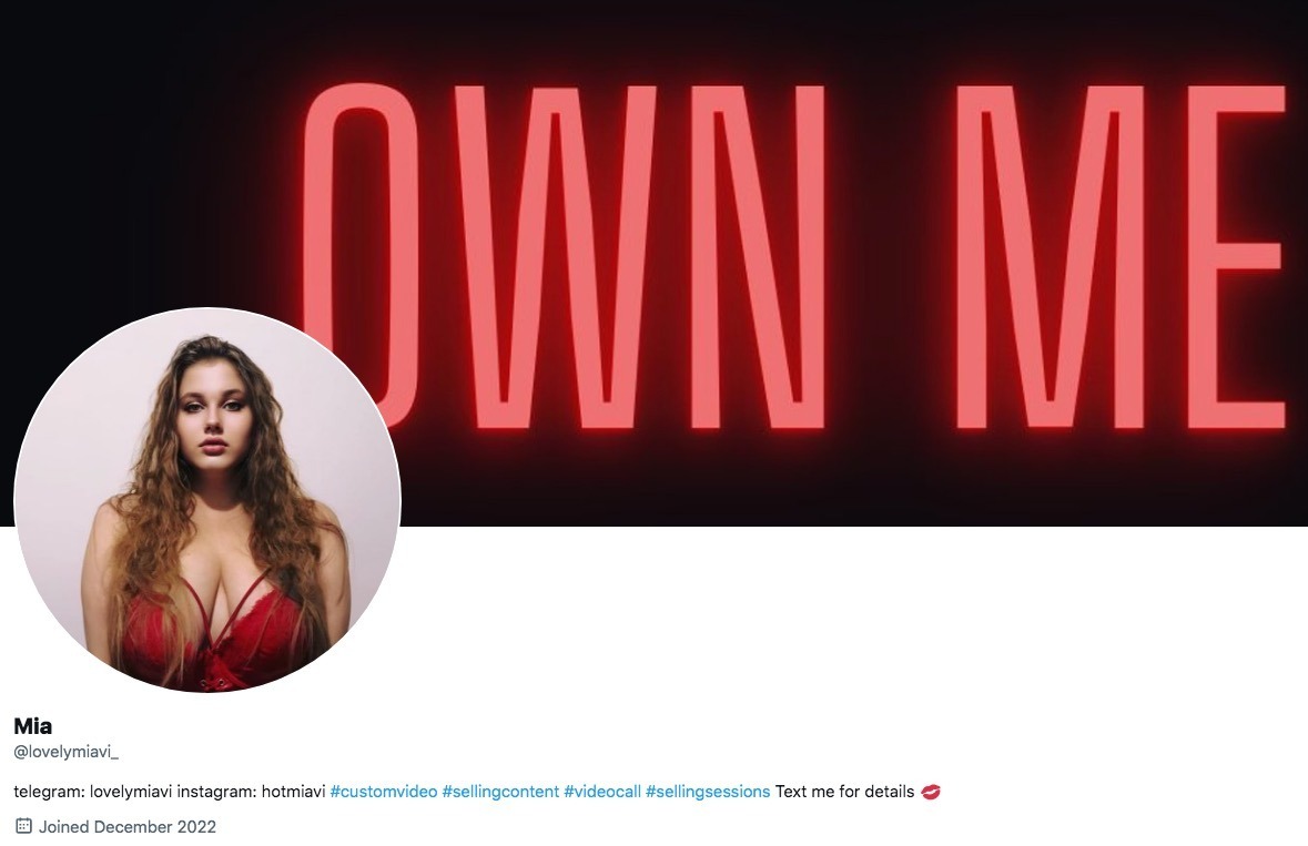 En el último grupo, el de las cuentas que ha borrado del mapa, se encuentra un perfil de Twitter que ha estado activo hasta hace unos días. Bajo el seudónimo de Mia, captaba clientes para sus contenidos eróticos y pornográficos. Esta es la faceta de su vida que más empeño ha puesto en esconder. Pero, una vez en la palestra, era cuestión de tiempo que viera la luz.