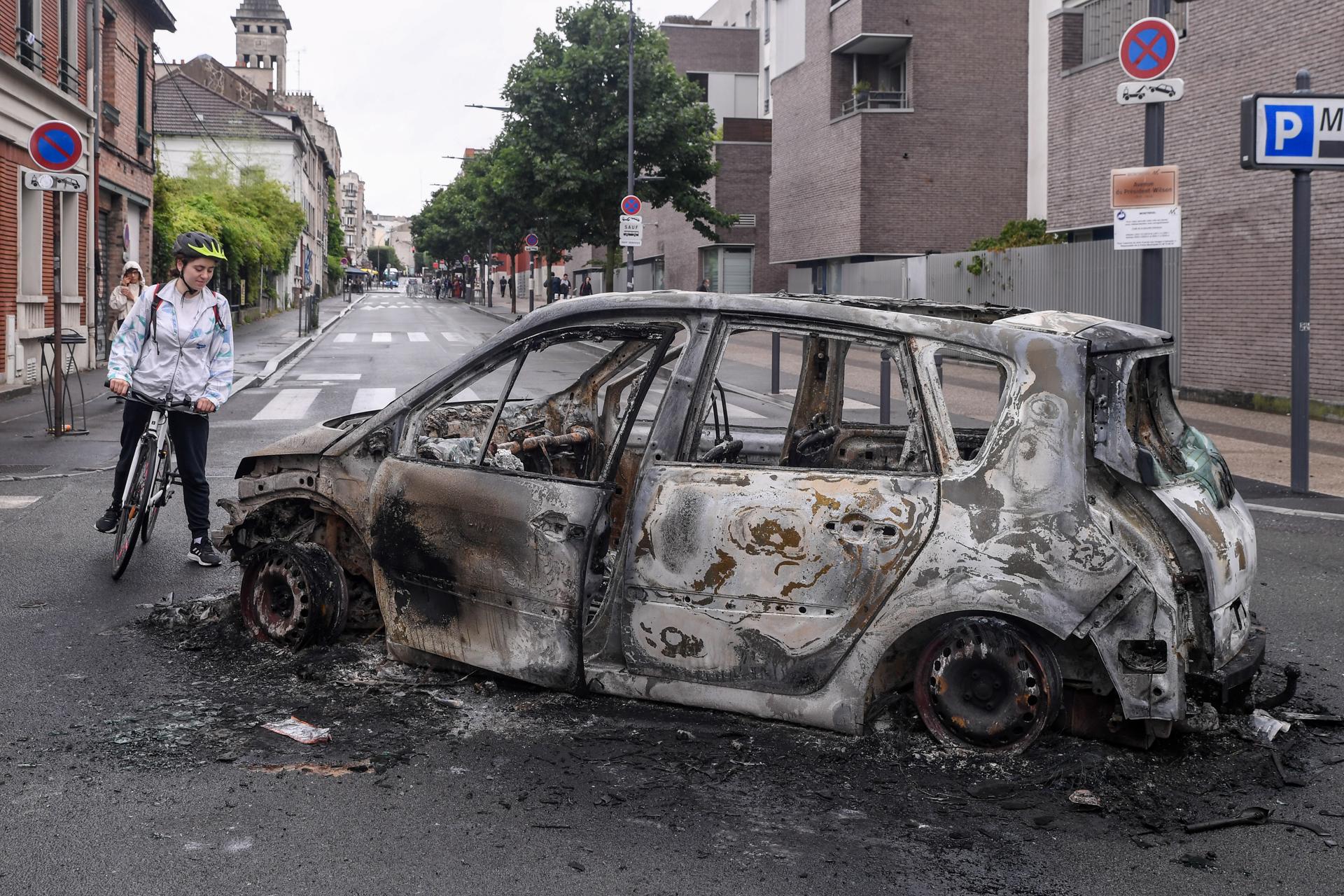 Restos de un coche quemado en Montreuil, cerca de París, durante la cuarta noche consecutiva de violentos disturbios en Francia. Lo que empezó como una manifestación por la muerte de Nahel se ha convertido en cuatro noches de violencia y vandalismo, incendios de edificios públicos y de vehículos, enfrentamientos con las fuerzas del orden, centenares de ellos heridos, y miles de detenidos, la mayoría jóvenes de entre 16 y 18 años.