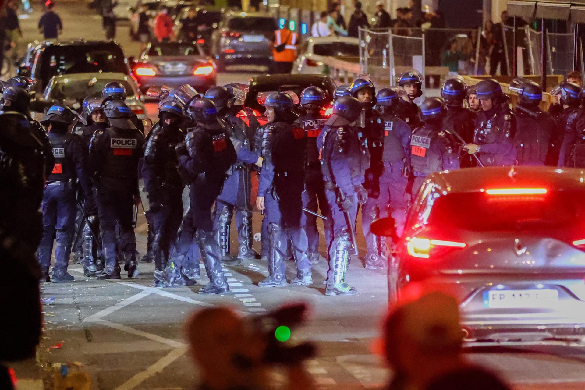 Las fuerzas de la policía antidisturbios aseguran el área cerca del Arco del Triunfo durante otra noche de enfrentamientos con manifestantes en París.