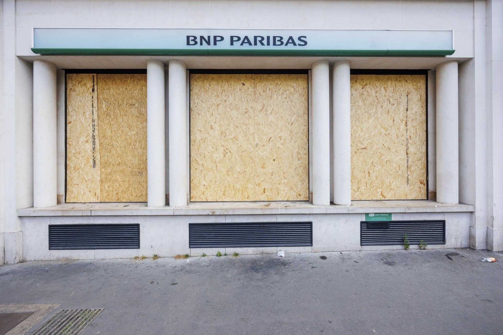 Una vista general muestra una sucursal bancaria de BNP Paribas tapiada en la Rue La Boetie cerca del Arco del Triunfo, luego de otra noche de enfrentamientos entre la policía y los manifestantes, en París.