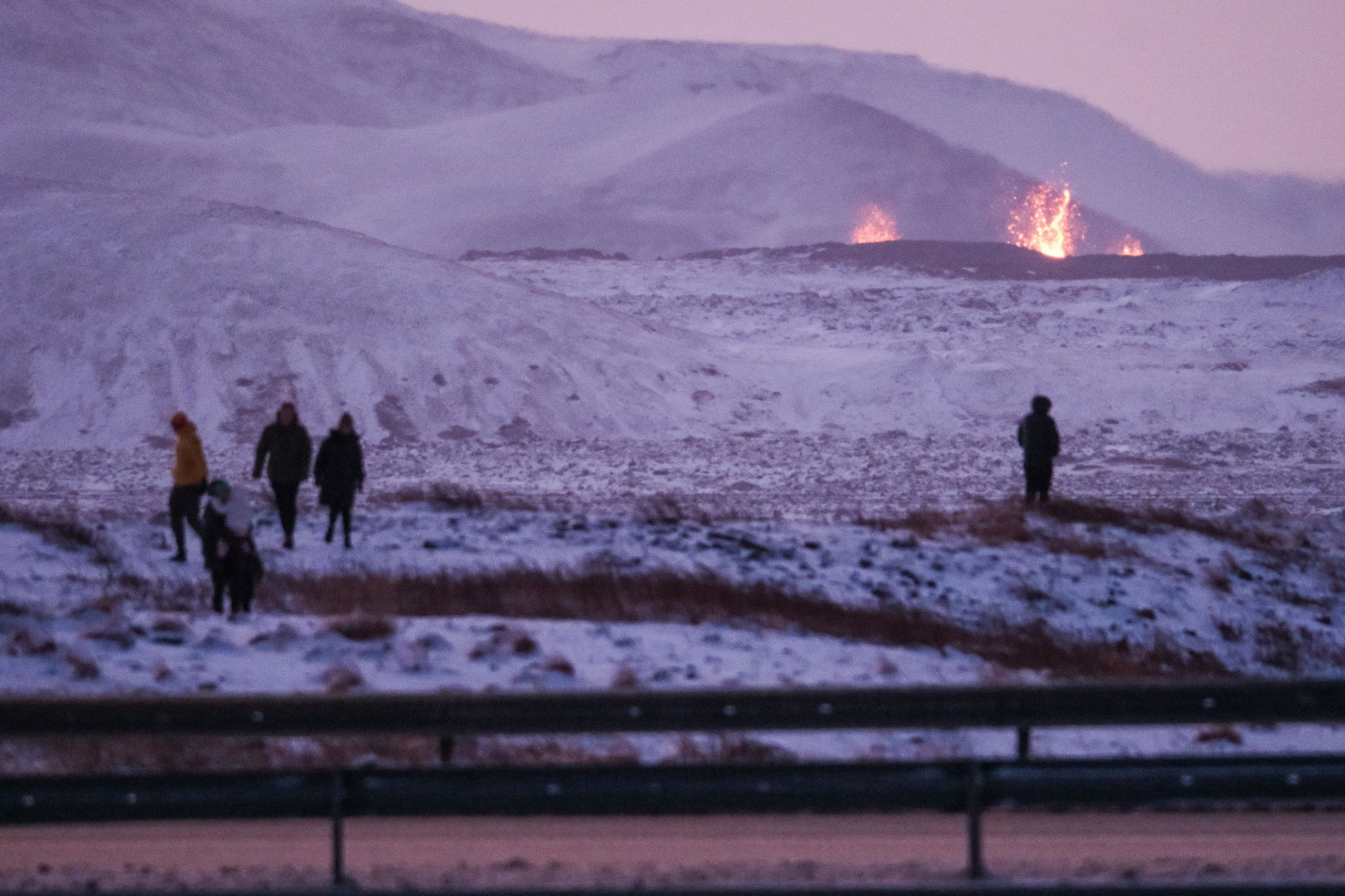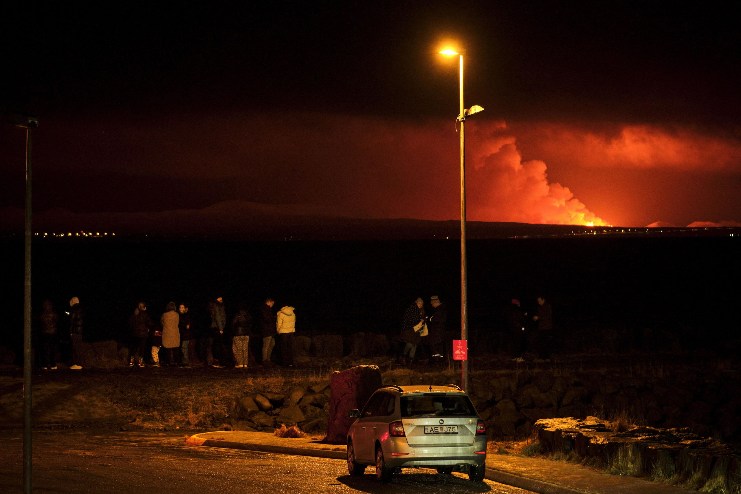 Espectadores se reúnen junto a la costa de Reykjavik para observar la erupción volcánica que comenzó cerca de la ciudad de Grindavik en la península de Reykjanes.