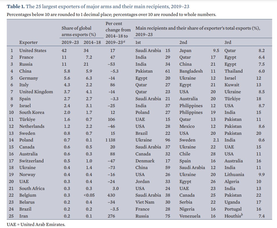 La clasificación de exportadores está encabezada por Estados Unidos, que copa el 42 por ciento del mercado mundial. En la segunda posición empatan Francia y Rusia, con el 11 por ciento. Rusia se desploma por la guerra de Ucrania, pues ahora no sólo debe producir casi en exclusiva para sí misma sino que algunos de sus productos se han visto afectados por su baja eficacia en el campo de batalla. Pierde 10 puntos porcentuales de mercado respecto al anterior quinquenio.