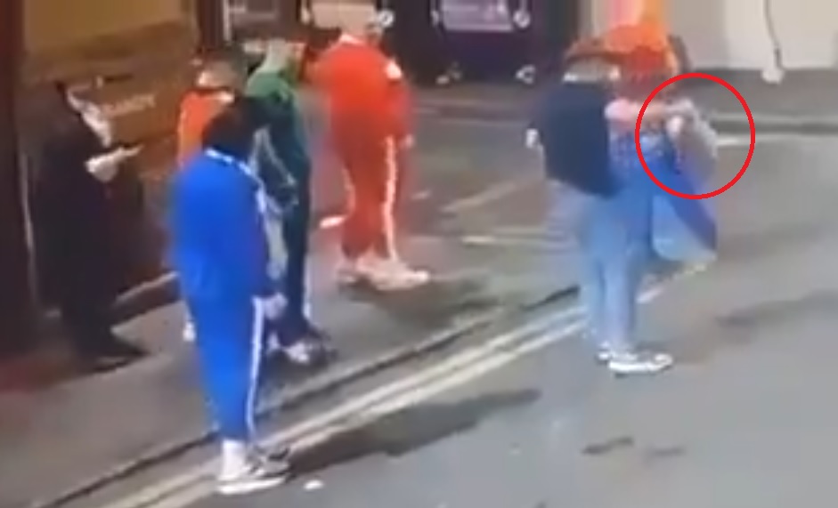 Las cámaras de vigilancia captaron el momento en el que esta persona -un varón- se topa con la cabeza y juguetea con ella hasta que se da cuenta de que no es un artículo de broma, como cabía esperar. En el video se aprecia cómo la coge y la suelta poco después, sobresaltado. Él iba con un grupo de amigos, todos disfrazados.