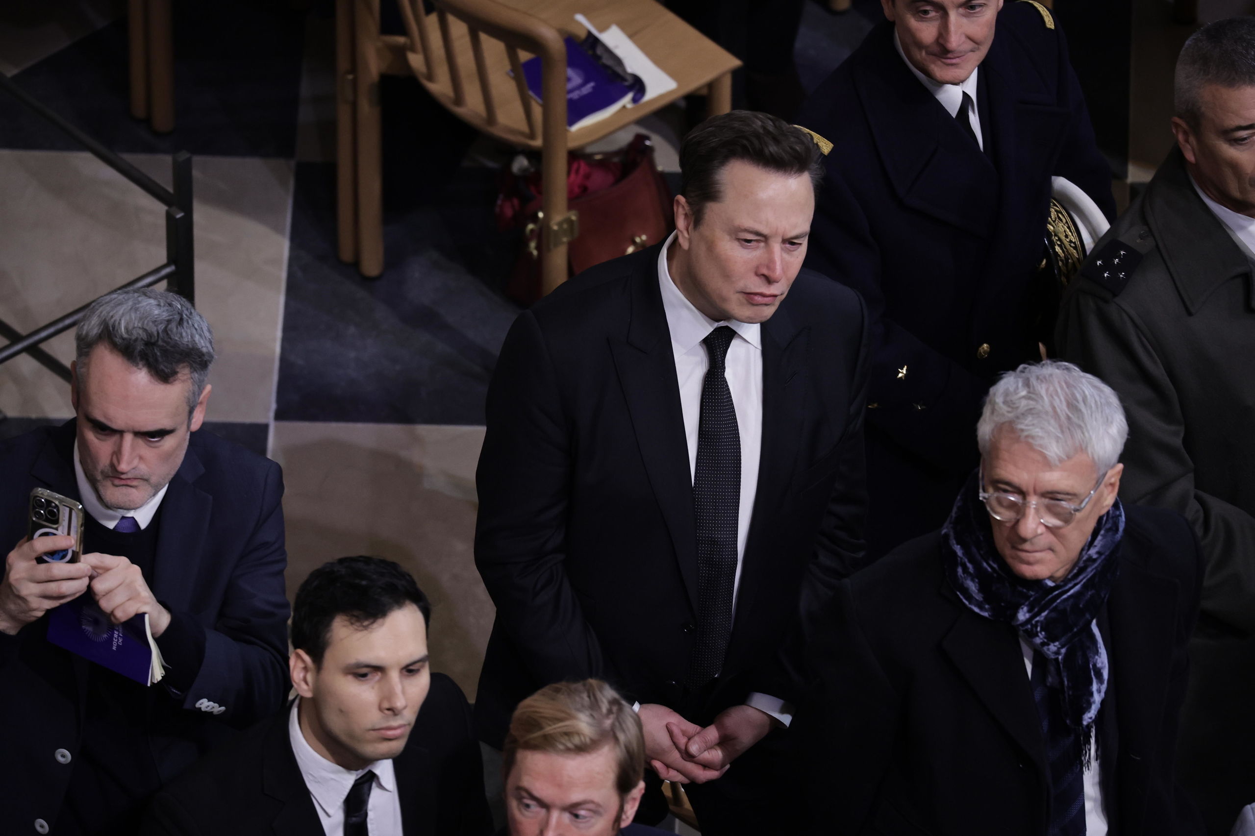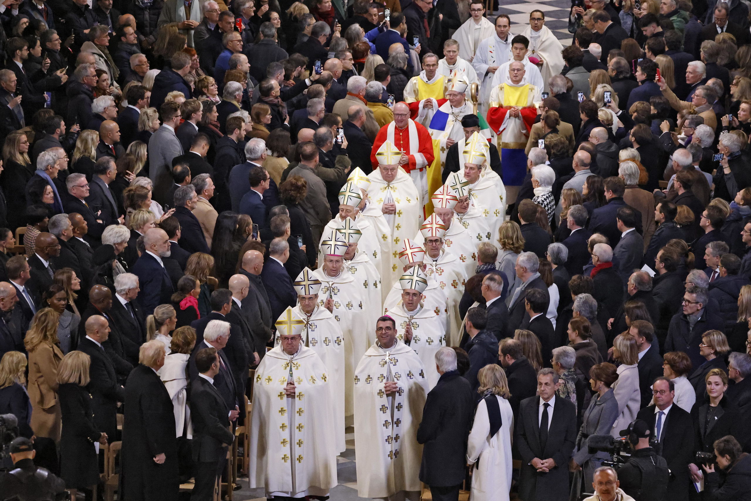 Un momento especialmente impresionante de la ceremonia de reapertura de Notre Dame, con el público en pie y obispos y arzobispos avanzando por la nave central.