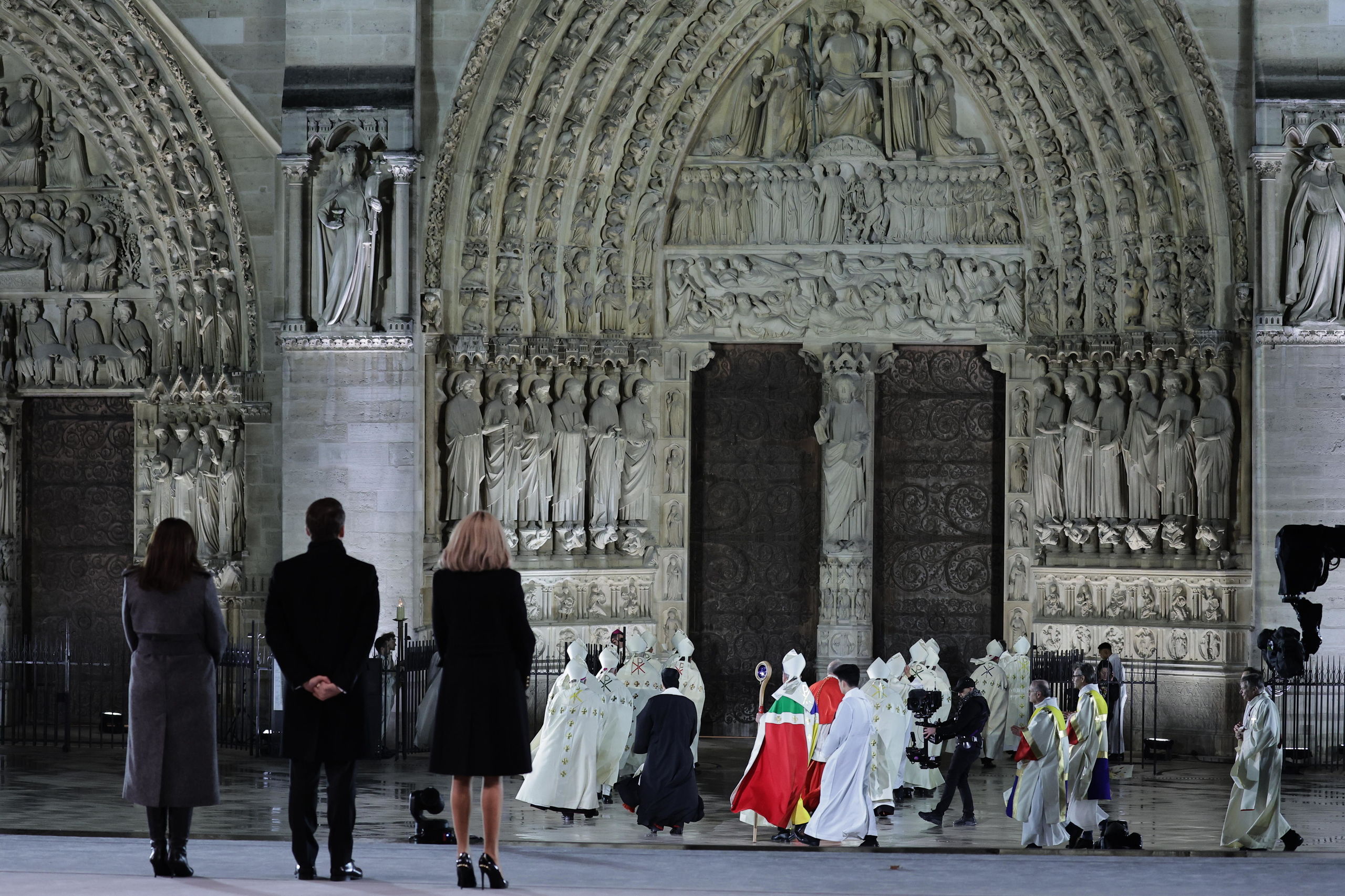 Macron y su mujer Brigitte contemplan como el arzobispo Laurent Ulrich procede a la reinaguración de Notre Dame golpeando sus puertas antes de que estas se abrieran para la ceremonia de reapertura.