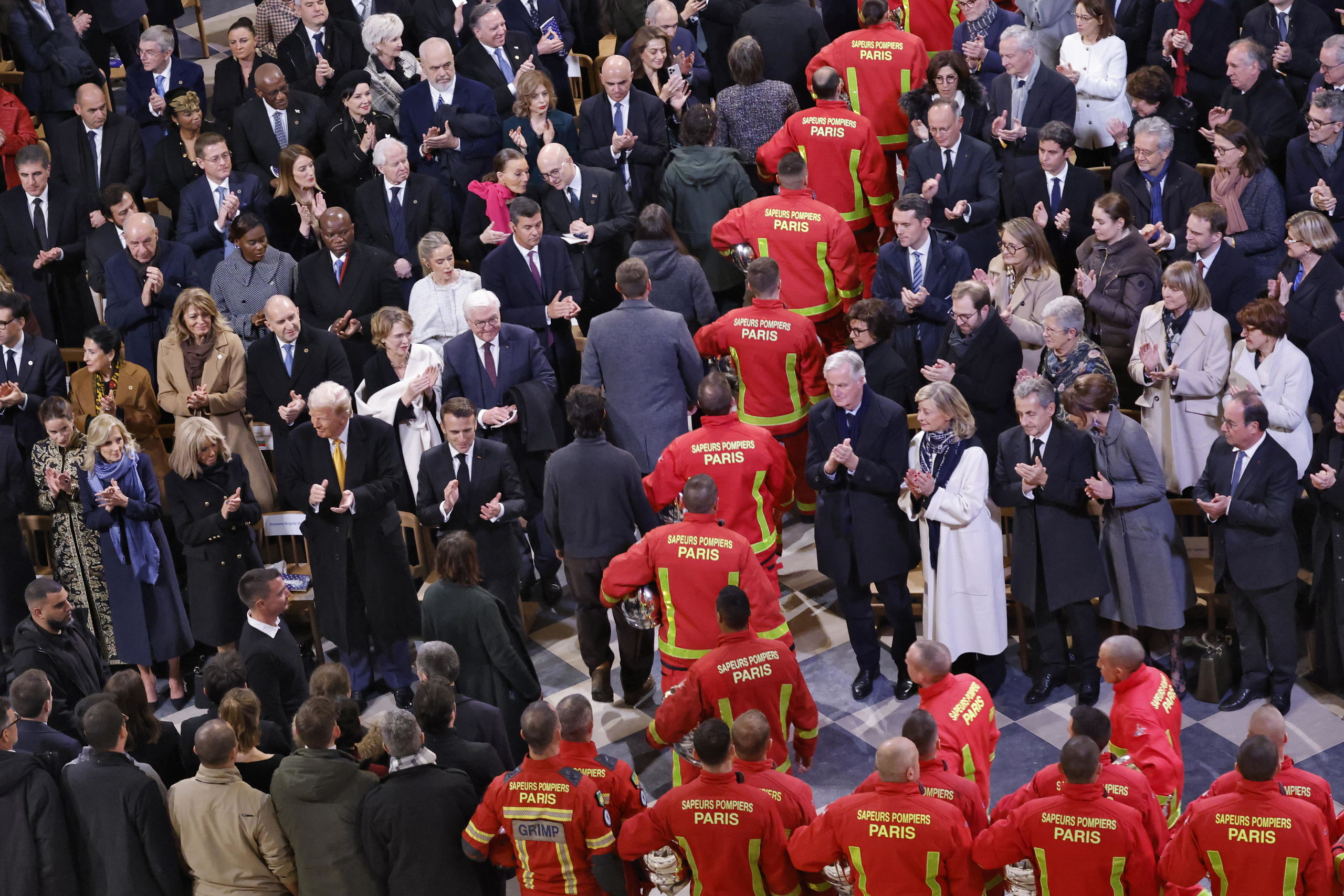 Bomberos y operarios de la reconstrucción reciben el aplauso de los demás asistentes a su entrada en la catedral de Notre Dame para la ceremonia.