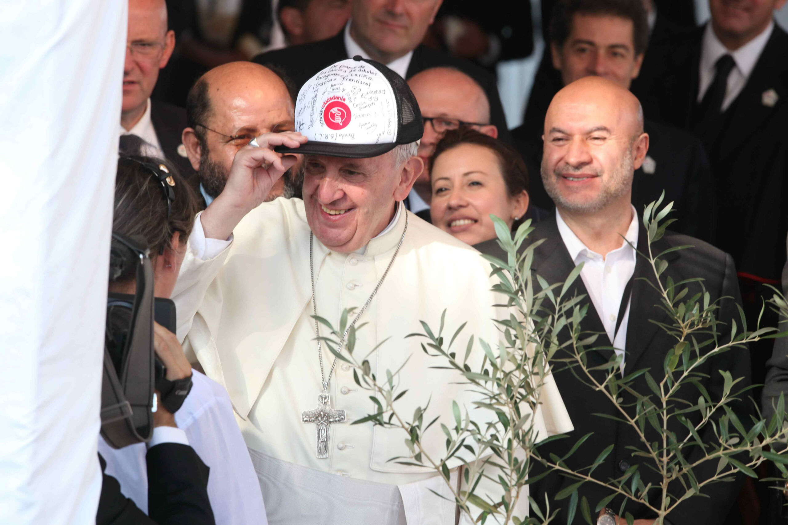 En 2015 el papa Francisco se puso una gorra llena de mensajes de agradecimiento que le regalaron durante una misa celebrada en "Ñu Guazu", una base militar en Asunción (Paraguay).