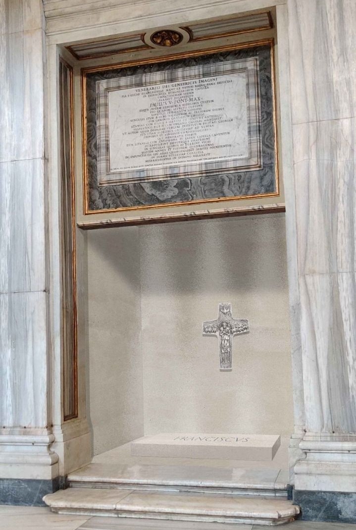 Según acaban de confirmar las fuentes oficiales del Vaticano, la tumba está hecha de mármol de la región italiana de Ligulo lleva la inscripción «FRANCISCUS» y una reproducción de su cruz pectoral. El emplazamiento de la tumba del Papa se ha preparado en un nicho de la nave lateral de la Basílica de Santa María la Mayor, entre la Capilla Paulina (Capilla de la Salus Populi Romani) y la Capilla Sforza, y se encuentra junto al Altar de San Francisco, tal y cómo expresó el pontífice en sus últimas voluntades.