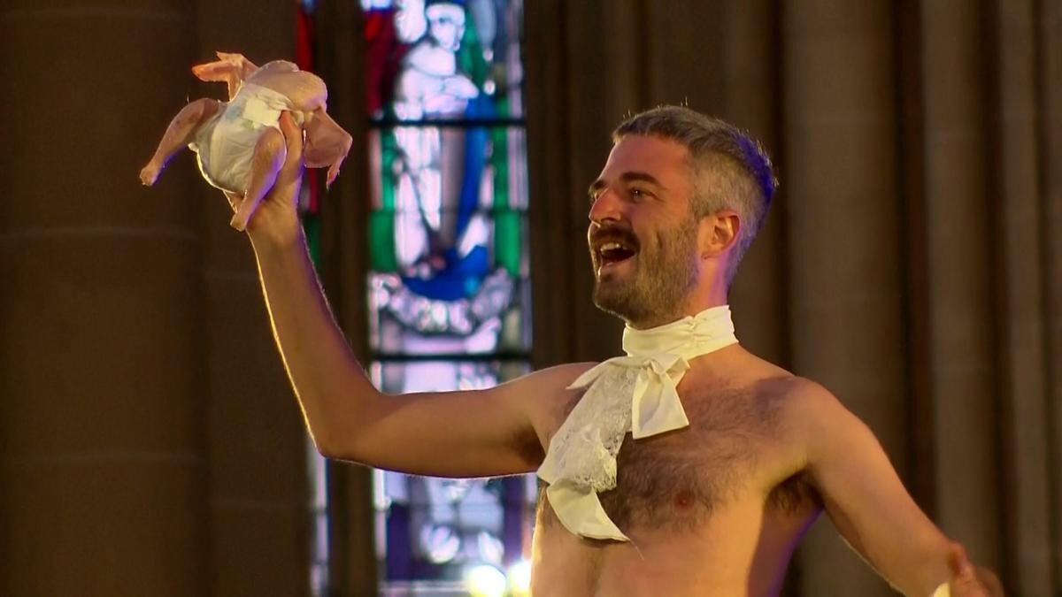 La actuación incluyó escenas controvertidas que han provocado mucha indignación en Alemania. Durante el ‘espectáculo’, tres intérpretes —una mujer y dos hombres sin prácticamente ropa— manipularon cadáveres de pollos crudos y sin cabeza, colocados en pañales, mientras cantaban. Los bailarines se movían por el escenario con guadañas, justo frente al altar de la catedral, en lo que muchos asistentes interpretaron como una burla grotesca hacia los elementos sagrados de la catedral.