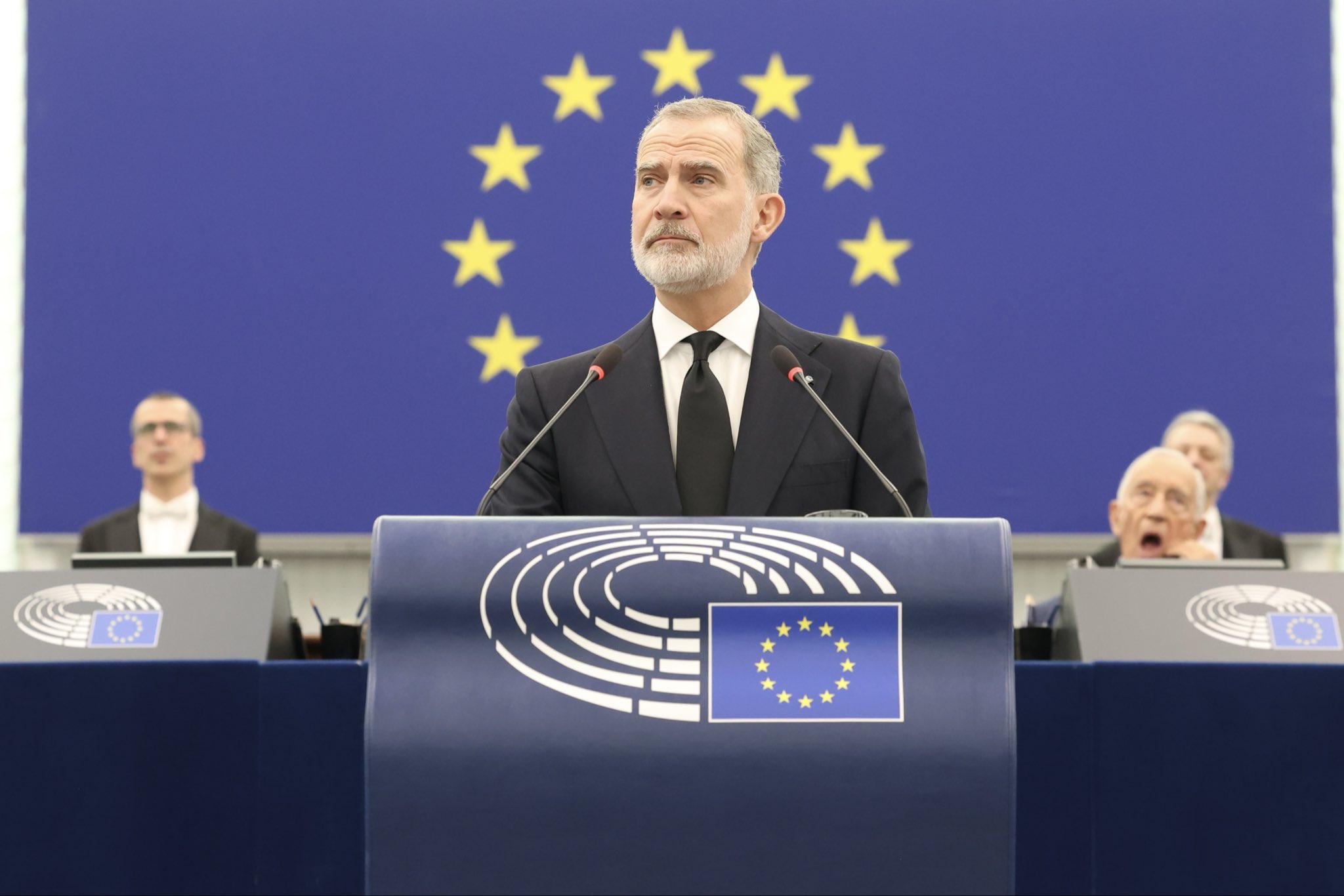 Durante su intervención, Felipe VI, que lucía corbata negra por el luto nacional de nuestro país, destacó los avances conjuntos de estos 40 años de camino en común: "En estas cuatro décadas, mi país, España, ha cambiado y ha crecido; y de cómo ha contribuido al cambio y al crecimiento de Europa. Esa historia me es muy familiar, porque es la mía; la mía y la de millones de españoles y europeos".