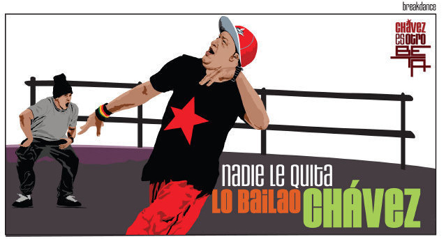 Su transformación en "colega de barrio" va tan allá, como para representar a Chávez como una estrella del break dance.