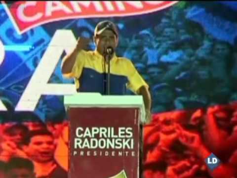 Henrique Capriles, candidato a la Presidencia de Venezuela: "En nombre de nuesto pueblo, le doy las gracias por lo bueno que haya podido usted hacer y por lo malo y por lo que usted haya dejado de hacer, la historia se encargará de juzgarlo. Yo lo que sí quiero decirle, con el más profundo respeto, es la hora del futuro, es la hora de avanzar y usted no va a detener el avance de este pueblo..."