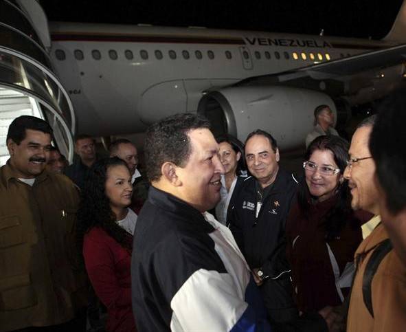 En silencio desde hace varios días, Hugo Chávez llegó de madrugada al aeropuerto de Maiquetía y esta vez las imágenes de su encuentro con ministros y colaboradores sí fueron difundidas por el canal estatal de televisión VTV: "Estoy muy feliz de llegar aquí de nuevo".