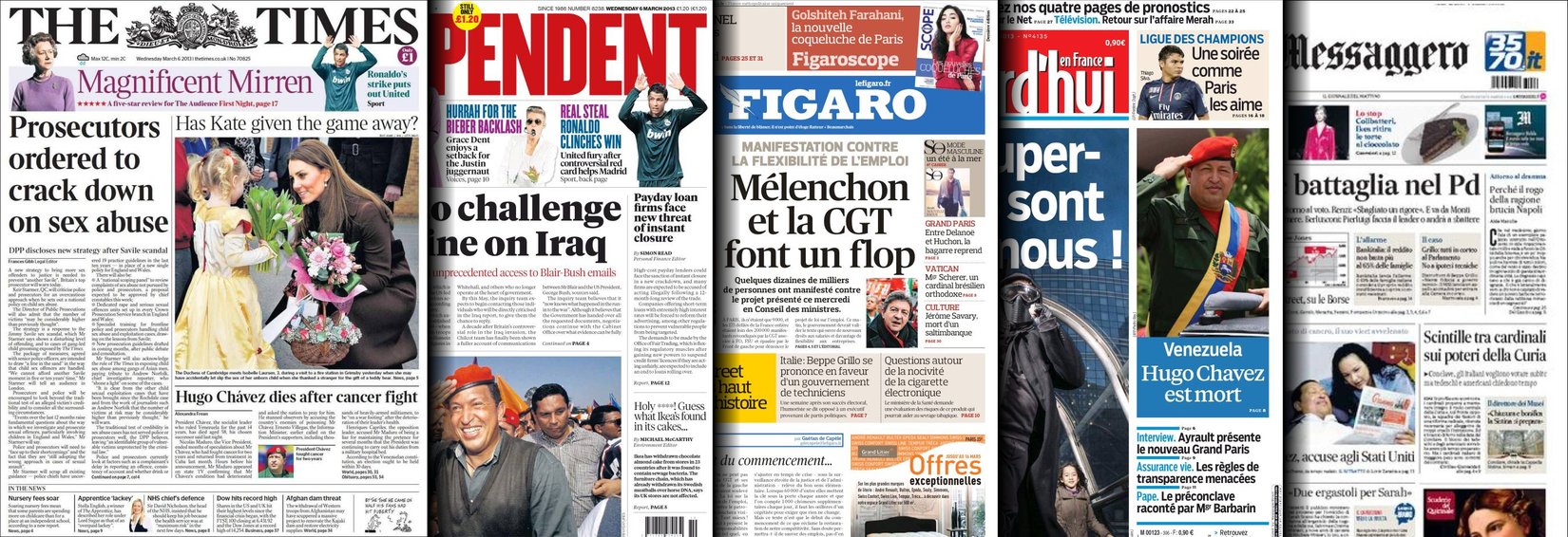 En Argentina, Chávez buena parte de la portada de Clarín, que además de contar lo que todo el mundo, recuerda el día que el presidente venezolano le "habló a Dios": "Dame tu corona, Cristo (...) Dámela, que yo sangro, dame tu cruz, cien cruces, pero dame vida, porque todavía me quedan cosas por hacer por este pueblo y por esta patria. No me lleves todavía, dame tu cruz, dame tus espinas, dame tu sable, que yo estoy dispuesto a llevarlas, pero con vida, Cristo mi señor".