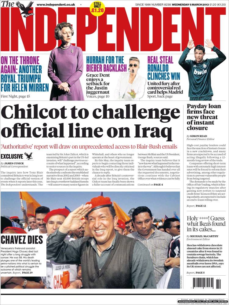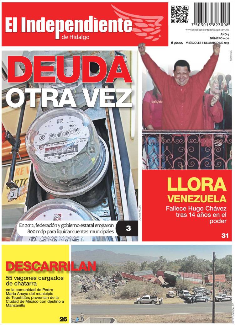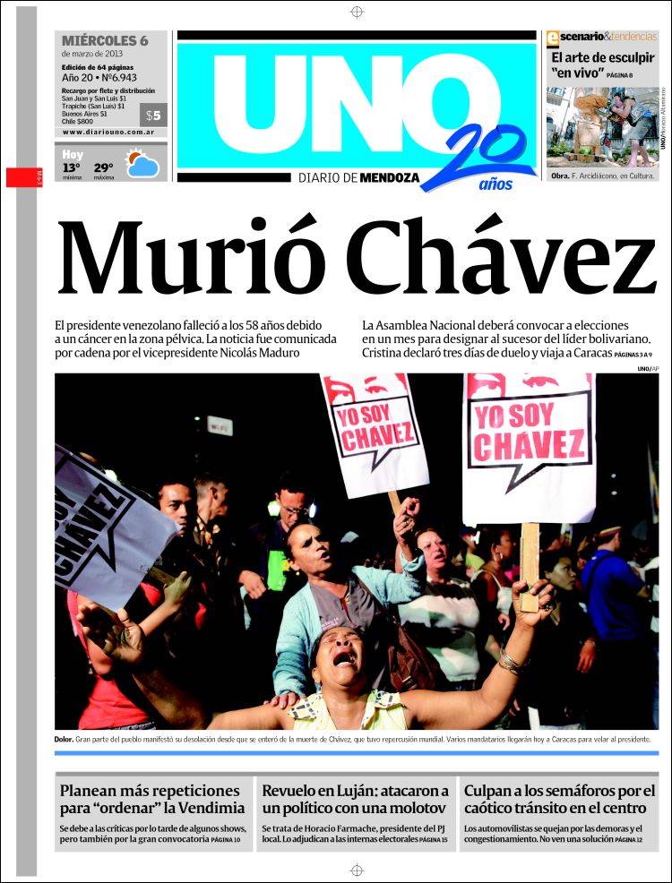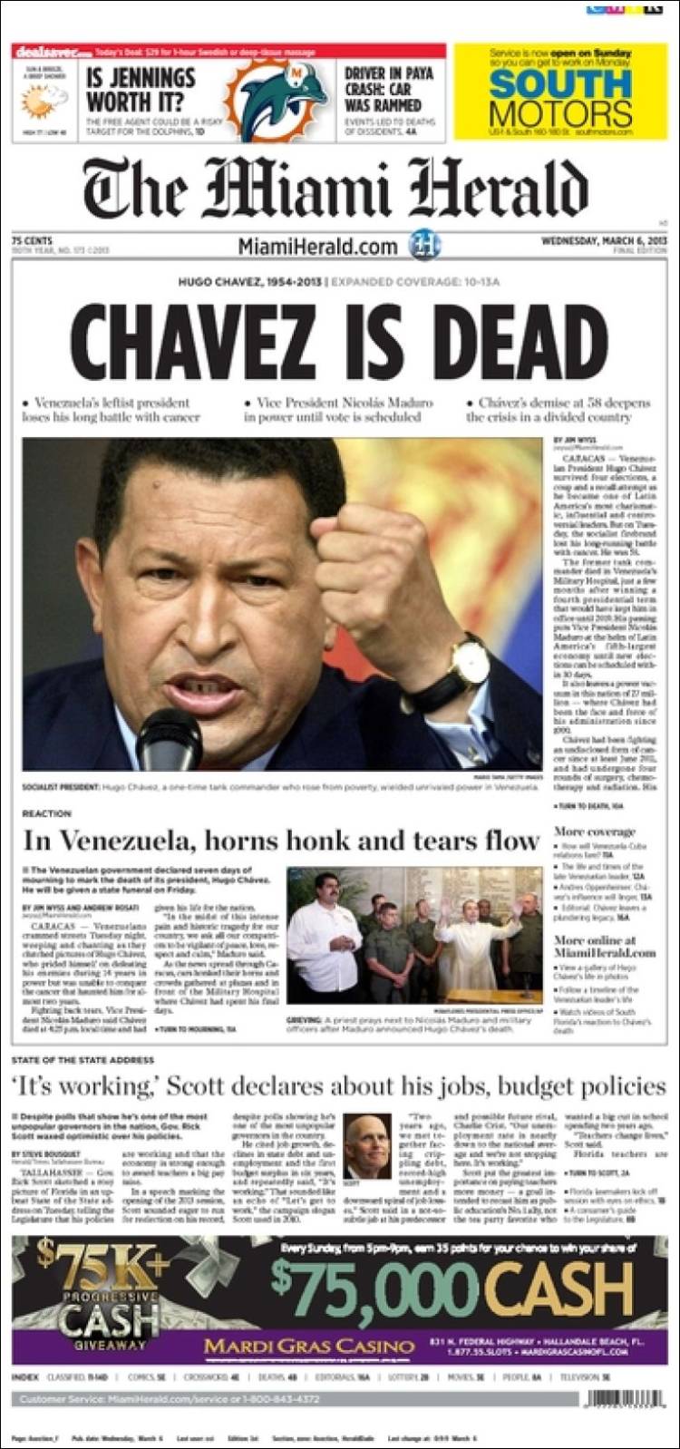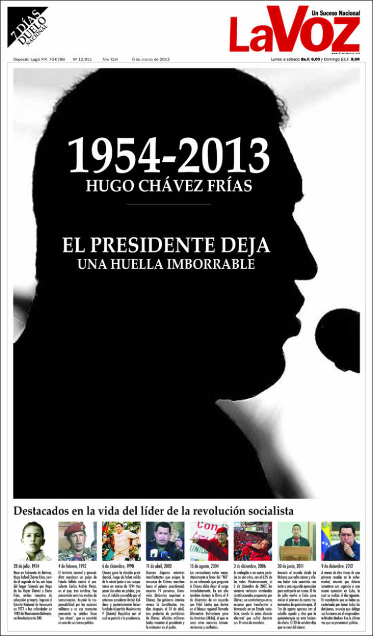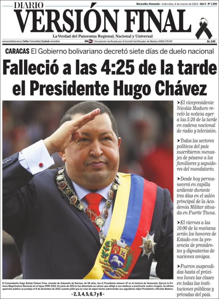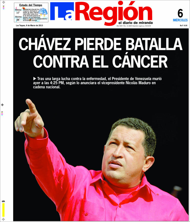 El presidente de Venezuela, Hugo Chávez, falleció este martes a las 16:25 horas (21:55 hora peninsular en España), a los 58 años de edad, tras más de año y medio de batalla contra el cáncer. Su muerte ocupa un lugar destacado en las portadas de los diarios más importantes de la prensa internacional.