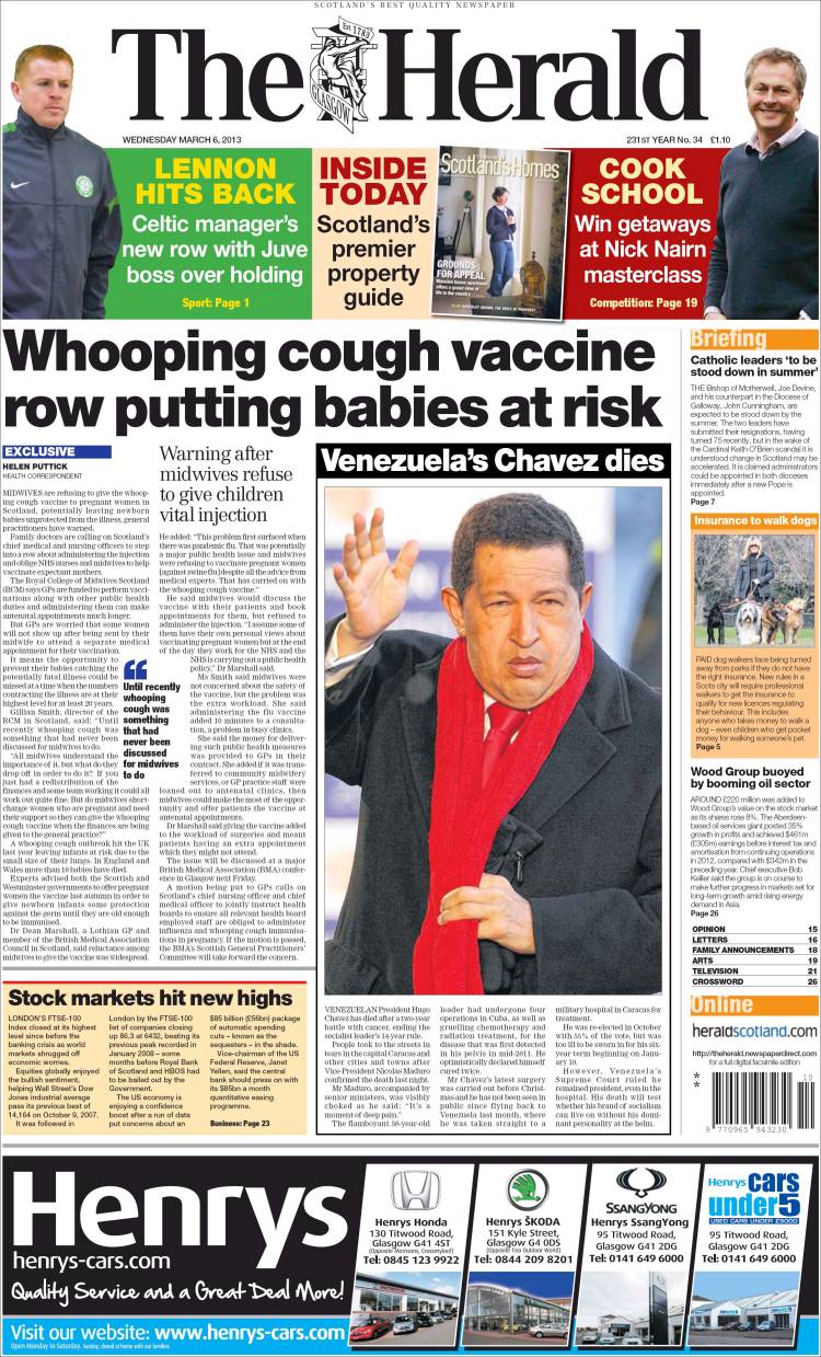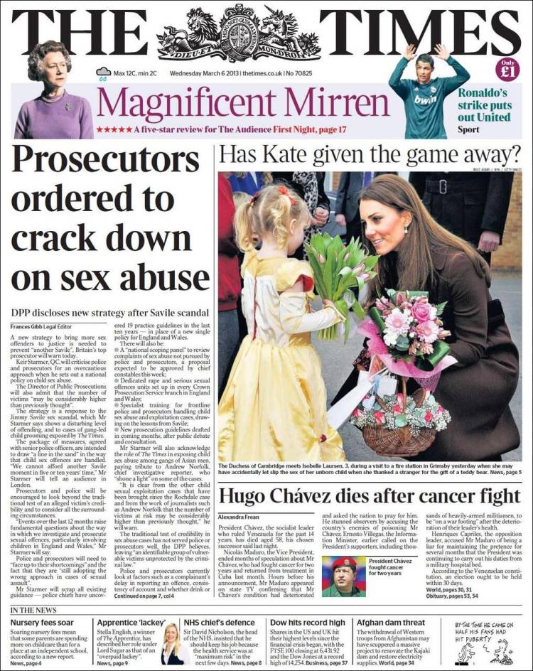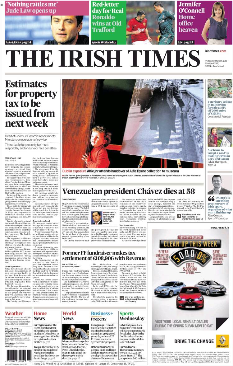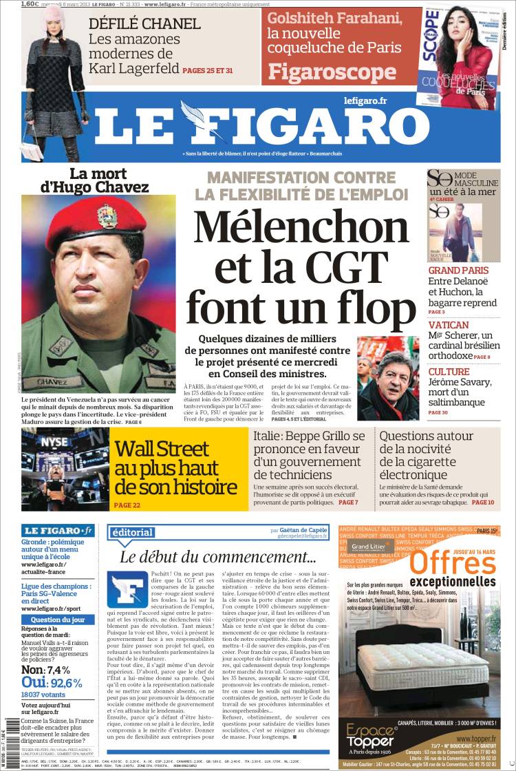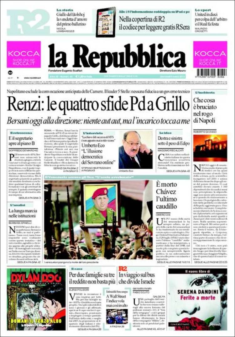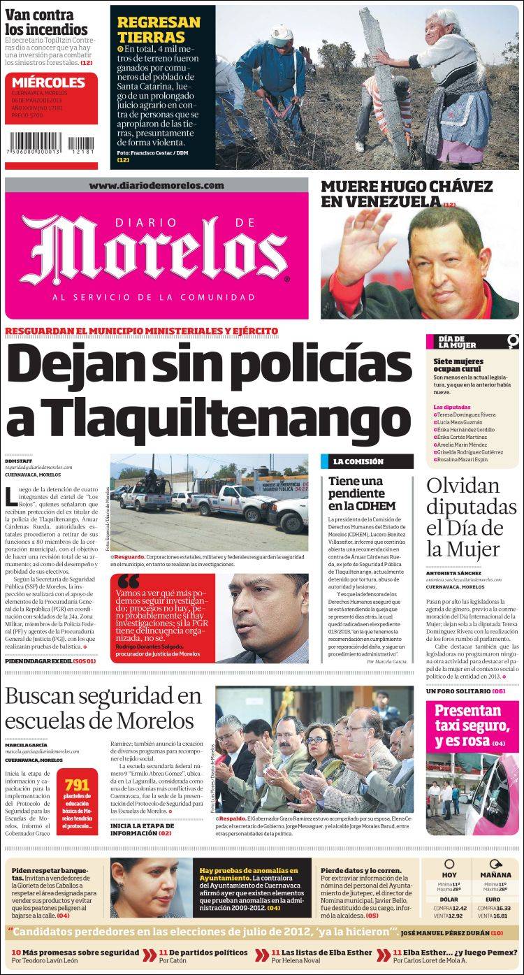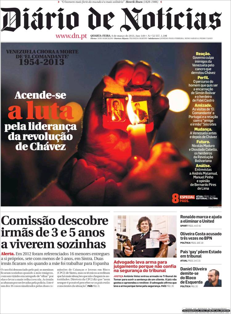El presidente de Venezuela, Hugo Chávez, falleció este martes a las 16:25 horas (21:55 hora peninsular en España), a los 58 años de edad, tras más de año y medio de batalla contra el cáncer. Su muerte ocupa un lugar destacado en las portadas de los diarios más importantes de la prensa internacional.