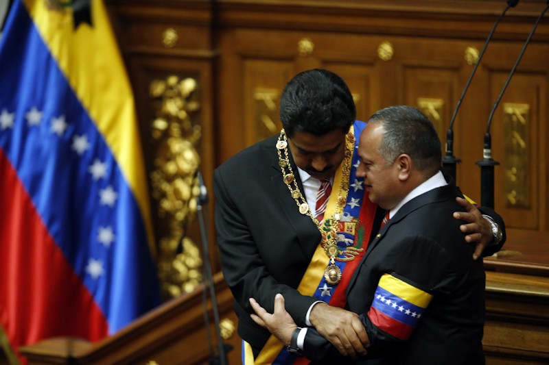 Maduro juró con la Constitución en la mano ante el presidente de la Asamblea Nacional, Diosdado Cabello, el mismo que según la Carta Magna debería tomar posesión de la jefatura del Estado, como cabeza del poder legislativo. Sin embargo, en una nueva "interpretación" constitucional, fue el nombrado sucesor por el propio Chávez el investido.