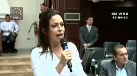 Durante su intervención de este martes en la Asamblea Nacional, la diputada opositora María Corina Machado hizo una defensa de los votos recibidos por parte de Henrique Capriles y denunció las irregularidades ocurridas durante la jornada electoral del pasado domingo.