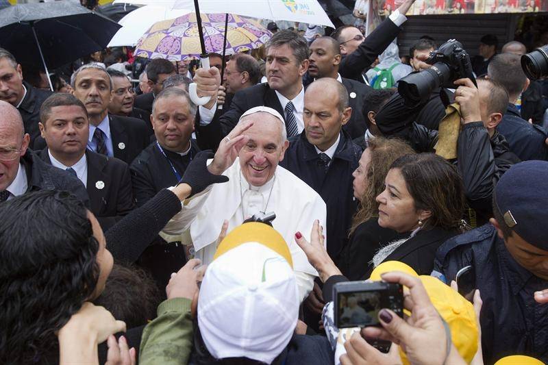 El Papa Francisco también ha visitado una favela de Río de Janeiro, donde dijo que "nadie puede permanecer indiferente ante las desigualdades que existen en el mundo" y pidió a los poderes públicos que trabajen por un mundo más justo. En una mañana lluviosa y fría y en medio de fuertes medidas de seguridad, con policía con armas de precisión y helicópteros sobrevolando, el Papa visitó el complejo de favelas de Manguinhos, en la zona norte de Río de Janeiro, lugar hasta finales del pasado año controlado por bandas de narcotraficantes y ahora una zona recuperada para la ciudad.