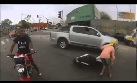 Un motociclista graba a través de una cámara instalada en su casco el robo a punta de pistola de su propia motocicleta. El delito ocurrió en una intersección de Brasil.