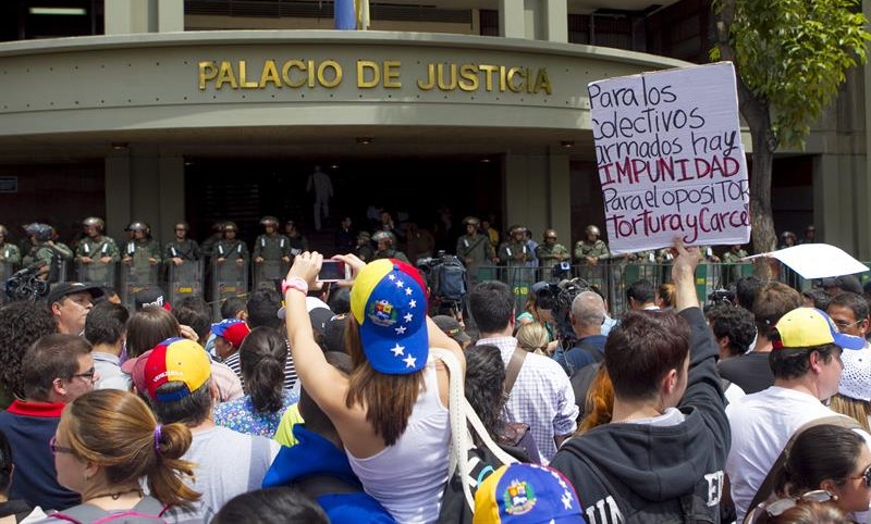 Cientos de estudiantes y seguidores de Leopoldo López se han movilizado al Palacio de Justicia de Caracas donde éste presta declaración –tras entregarse a las autoridades este martes– para responder por los delitos que se le imputan relacionados con la violenta jornada del 12 de febrero.