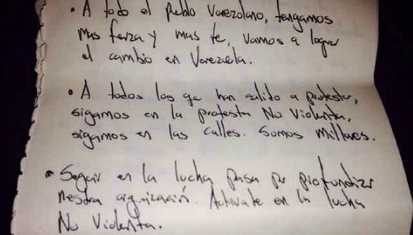 En la misiva, el líder del partido Voluntad Popular (VP) pide "a todo el pueblo venezolano", que tenga "más fuerza y más fe". "Vamos a lograr el cambio en Venezuela", añade. De la misma forma, ha reclamado a los manifestantes que sigan con la protesta "no violenta" y asegura que son "millones" los que piensan como ellos.