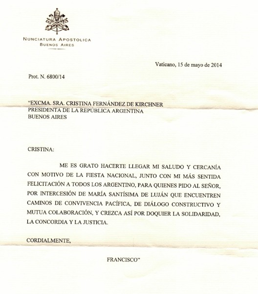 La carta falsa a la presidenta –dirigida a "Cristina" y firmada como "Francisco"–, señala que "me es grato hacerte llegar mi saludo y cercanía con motivo de la Fiesta Nacional, junto con mi más sentida felicitación a todos los argentino (sic), para quienes pido al Señor, por intercesión de María Santísima de Luján, que encuentren caminos de convivencia pacífica, de diálogo constructivo y mutua colaboración, y crezca así por doquier la solidaridad, la concordia y la justicia".