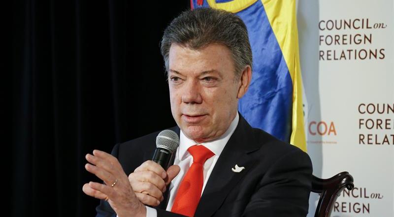 Uno de ellos ha sido un coloquio en la sede de la Americas Society/Council of the Americas frente a una serie de inversores interesados en Colombia como destino de sus actividades. Ahí se refirió a las conversaciones de paz que mantiene con los terroristas de las Fuerzas Armadas Revolucionarias de Colombia (FARC), un proceso duramente criticado por algunos de sus adversarios políticos como su predecesor y antes aliado Álvaro Uribe. Por eso, el presidente aprovechó "la oportunidad para decir a los inversores que no tenemos nada que ver con el castrochavismo, como se ha dicho allá en Colombia. Eso no va a suceder".
