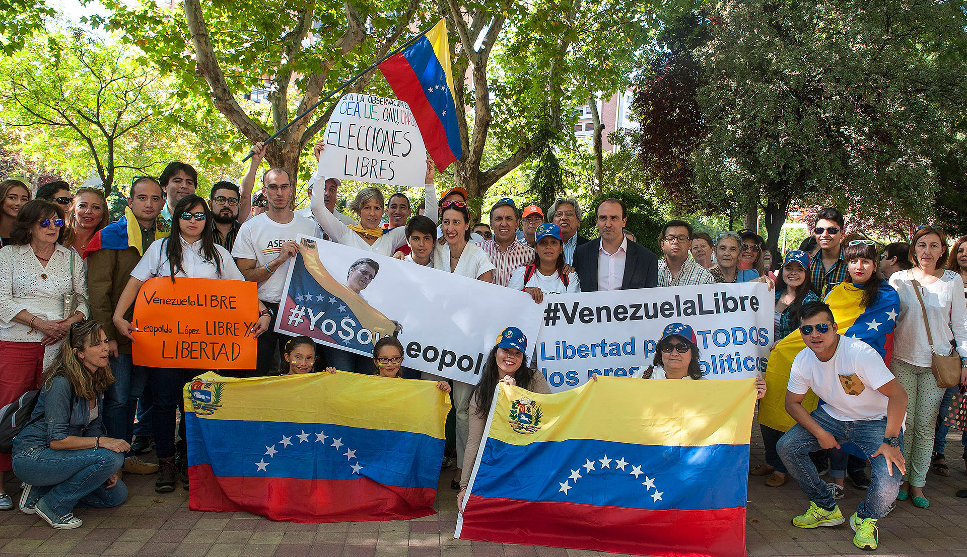 Bajo consigas como "Leopoldo Libertad" o "Leopoldo, amigo, el pueblo está contigo", los manifestantes, en su mayoría venezolanos residentes en Madrid, han marchado pacíficamente desde el estadio Santiago Bernabéu hasta la embajada Venezolana en España, al igual que lo han hecho otros compatriotas en otras 21 ciudades de todo el mundo, así como en 22 de Venezuela.