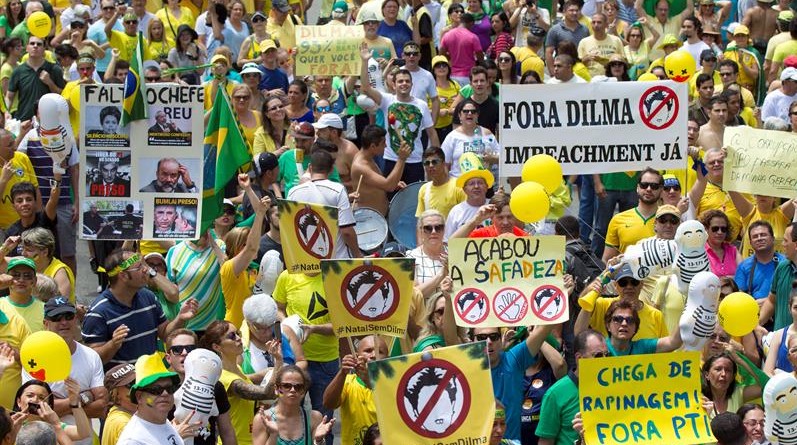 Al grito de "Fuera Dilma", numerosos ciudadanos vestidos de verde o amarillo, en su mayoría, recorrieron este domingo algunos de los puntos más emblemáticos del país, portando pancartas que pedían la destitución de la jefa de Estado brasileña.