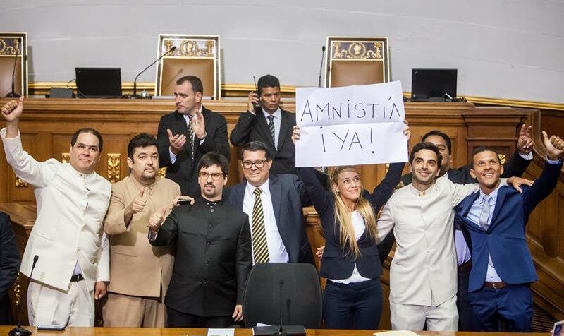 Dentro de las instalaciones del Parlamento estuvieron Lilian Tintori, Mitzy Capriles y Patricia Gutiérrez, esposas de los dirigentes opositores presos Leopoldo López, Antonio Ledezma y Daniel Ceballos, además de alcaldes y gobernadores de la oposición como el dos veces candidato presidencial Henrique Capriles. Muchos de ellos, como la propia Tintori, llevaron carteles pidiendo la amnistía de los presos políticos, algo que los líderes opositores confirmaron que harían.