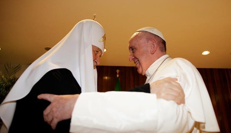 "Finalmente", dijo el papa Francisco cuando se encontró y abrazó con el patriarca ruso en la pequeña sala del aeropuerto en la que habían colocado las dos banderas del Vaticano y Rusia y un crucifijo.