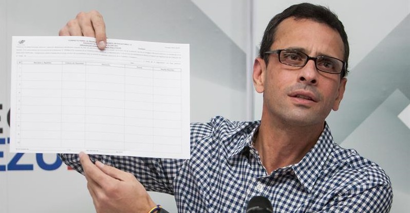 El líder opositor y candidato a la Presidencia de la MUD en las dos últimas elecciones, Henrique Capriles, dijo este lunes que las marchas hacia las oficinas de CNE previstas en todas las ciudades para este miércoles se desconvocarían si el CNE entregaba el formulario. Por esa razón, este martes Capriles confirmó esta decisión y apuntó que "la convocatoria era para movilizarse al CNE para buscar esta planilla" y agregó que "los puntos de concentración, de inicio (de la marcha) se van a convertir ahora en puntos de recolección de firmas, no podemos perder tiempo".