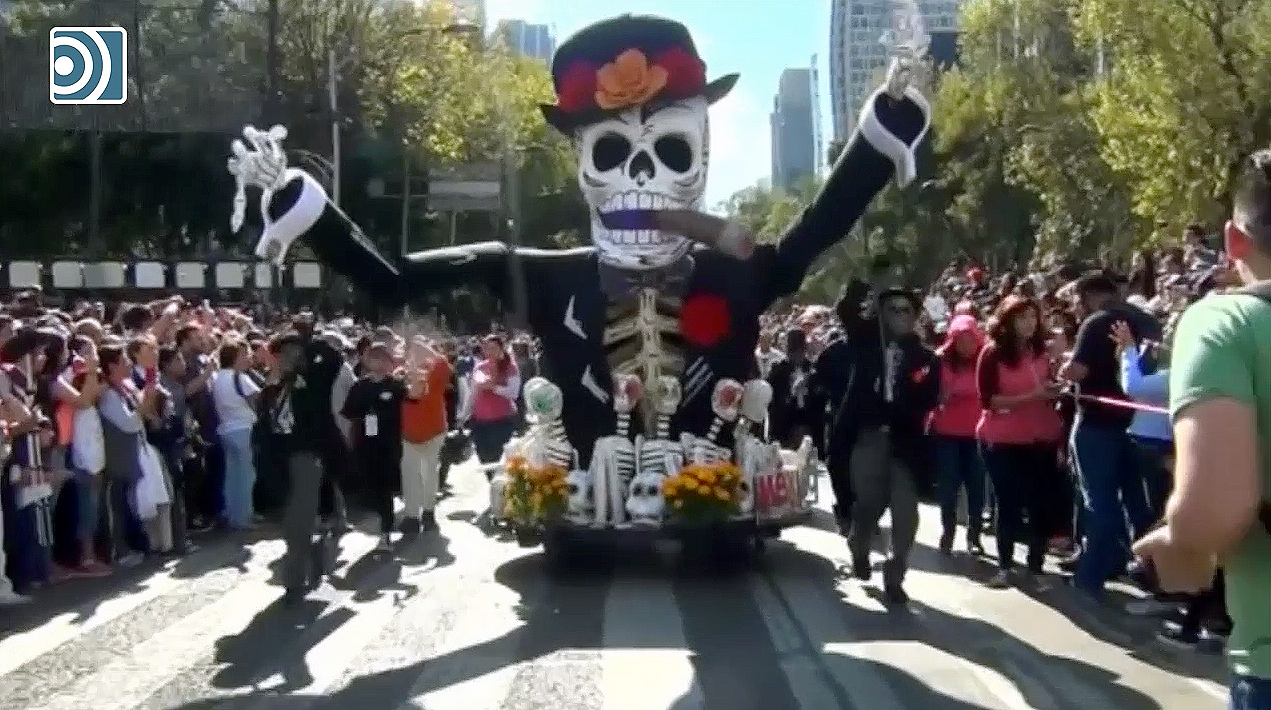 Decenas de miles de espectadores disfrutaron en la Avenida Reforma, en la Ciudad de México, del primer desfile del día de los muertos, en el que se pudieron ver coloridos disfraces, muchos esqueletos, calaveras, flores de colores brillantes y esculturas de arte popular conmemorando el Día de los Muertos.