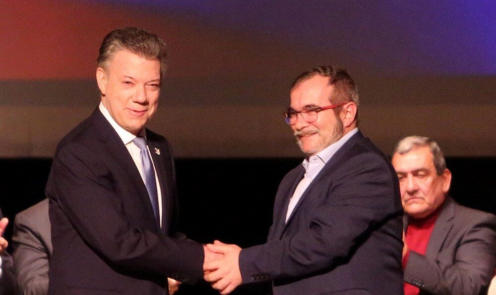 Juan Manuel Santos, y el jefe máximo de los terroristas de las Fuerzas Armadas Revolucionarias de Colombia (FARC), Rodrigo Londoño, alias Timochenko, firmaron este jueves en el Teatro Colón de Bogotá el nuevo acuerdo de paz, después de que el primer texto fuera rechazado por la mayoría de colombianos el pasado 2 de octubre.