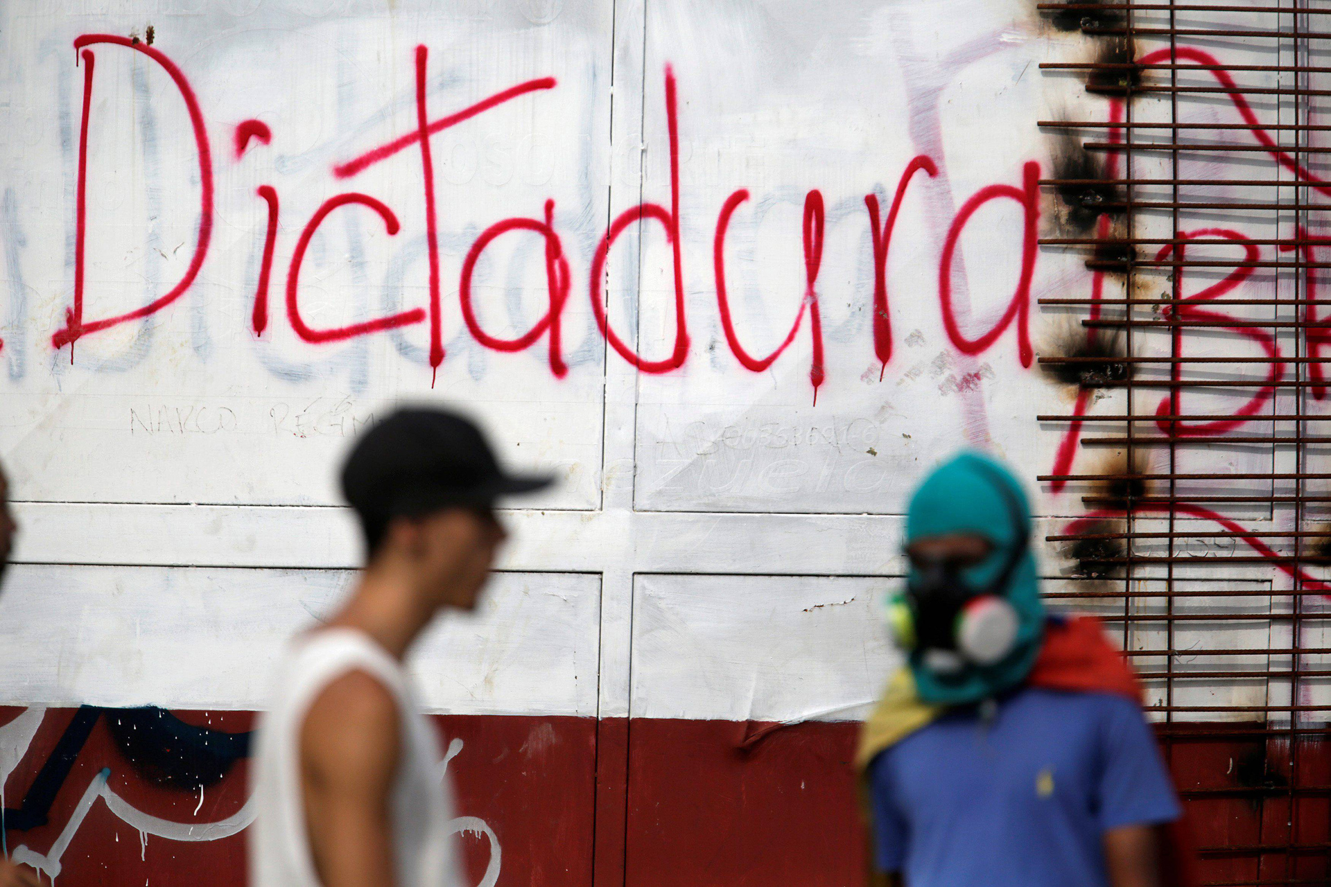 Una pintada en una fachada de Caracas donde se puede leer la palabra \"Dictadura\".