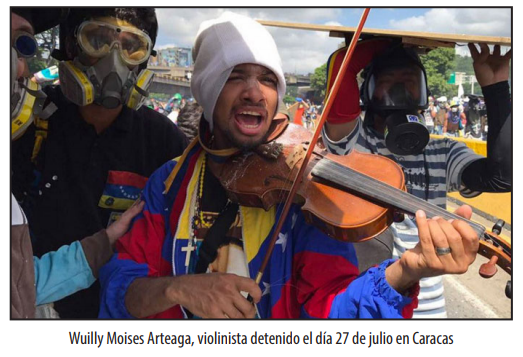 Otro caso emblemático es el de Wuilly Moisés Arteaga, violinista que se dio a conocer por ejercer una forma de protesta pacífica tocando su violín en medio de las protestas y la represión de las fuerzas chavistas. Wuilly fue detenido con su violín el 27 de julio en Bello Campo, Municipio Chacao, en Caracas y lo mantuvieron incomunicado durante varios días. Durante su arresto fue golpeado con los cascos de los funcionarios en la cabeza, hasta el punto de perder la audición en su oído derecho, y quemado su cabello con un mechero.