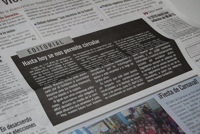 "Hasta hoy nos permiten circular. Luego de 114 años de existencia del diario El Impulso, la falta de materia prima, nos obliga a suspender de forma indefinida nuestra edición impresa", informó el periódico en su editorial.